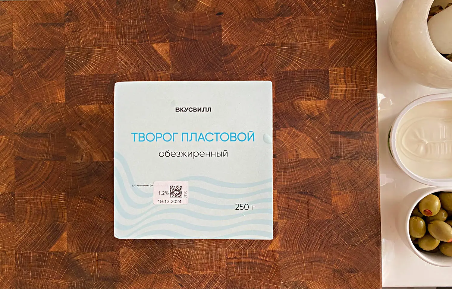 Смешайте в чаше блендера 250 граммов обезжиренного пластового творога, столовую ложку сливочного сыра, 70 граммов просушенных от маринада оливок и молотый перец. Попробуйте готовую творожную массу на соль. При необходимости немного посолите.