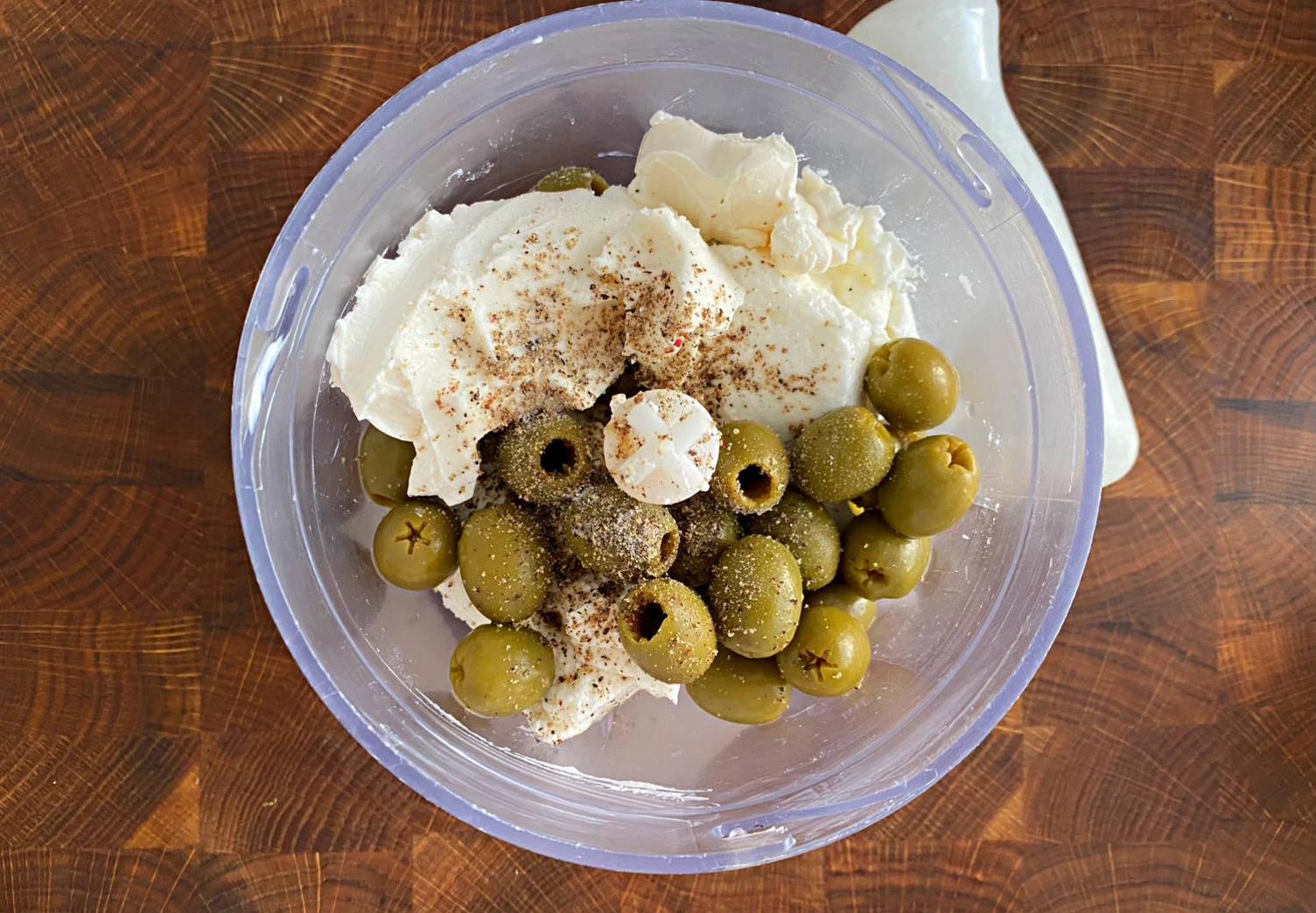 Важное уточнение: в этот раз я вмешиваю измельчённые оливки сразу в творожную основу, но на ваш вкус вы можете класть оливки или даже виноградинки без косточек целиком внутрь творожных шариков. Настоятельно рекомендую использовать сливочный сыр с добавлением сыра «Фета». Столовая ложка солоноватой горчинки замечательно дополняет всю эту сливочно-орехово-оливковую компанию, обыгрывая творожную кислинку и избавляя от необходимости использовать добавленную соль. Оливки, фаршированные сладким перцем — это важно. Пикантную сладость, которую придаёт перец маринованным оливкам, невозможно ничем заменить. *здесь должен быть призыв к петиции за возвращение во ВкусВилл оливок с красным перцем.