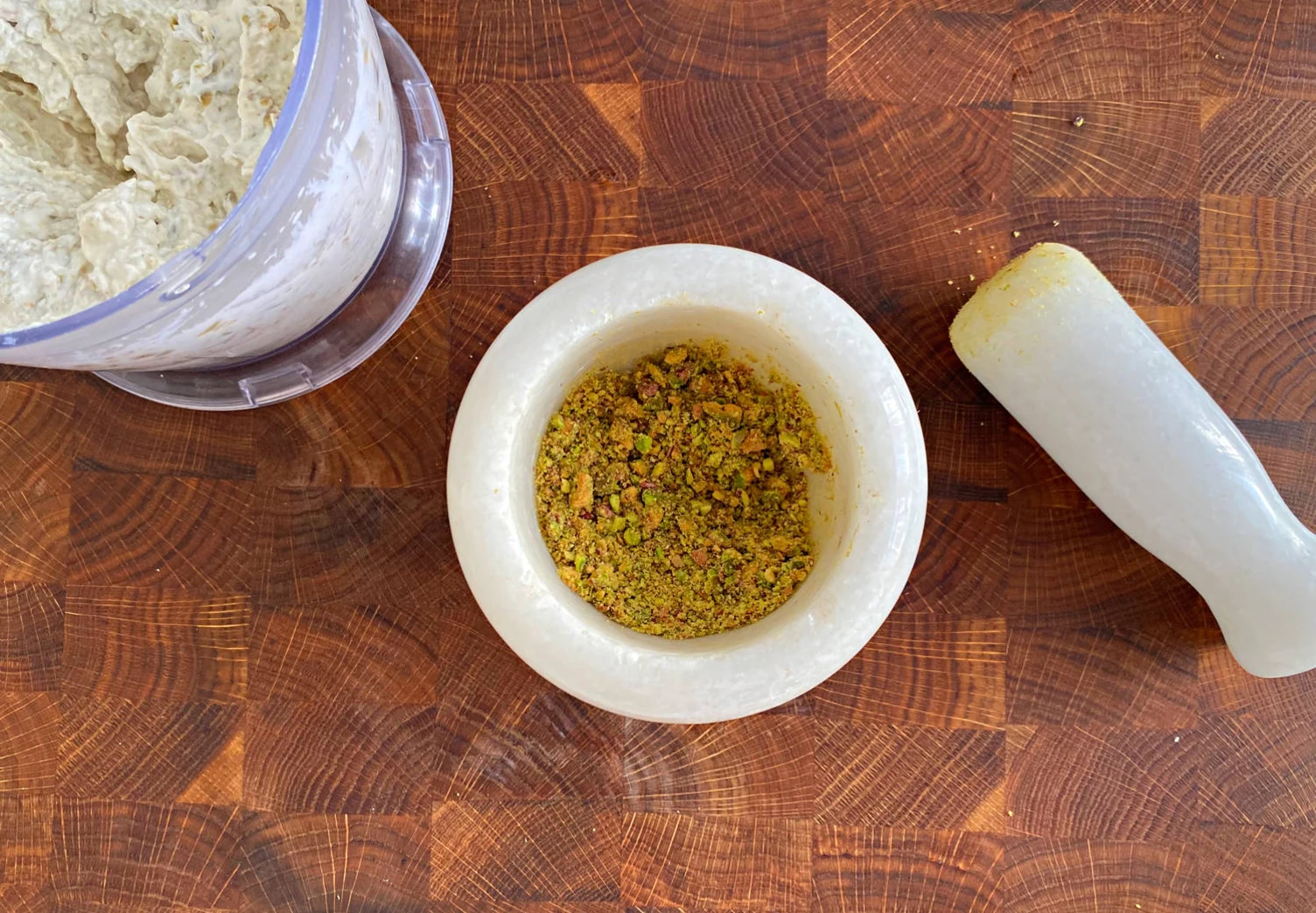 В ступке/в пакете/ножом на доске — любым удобным способом измельчите фисташки и пересыпьте их в плотный прозрачный пакет.