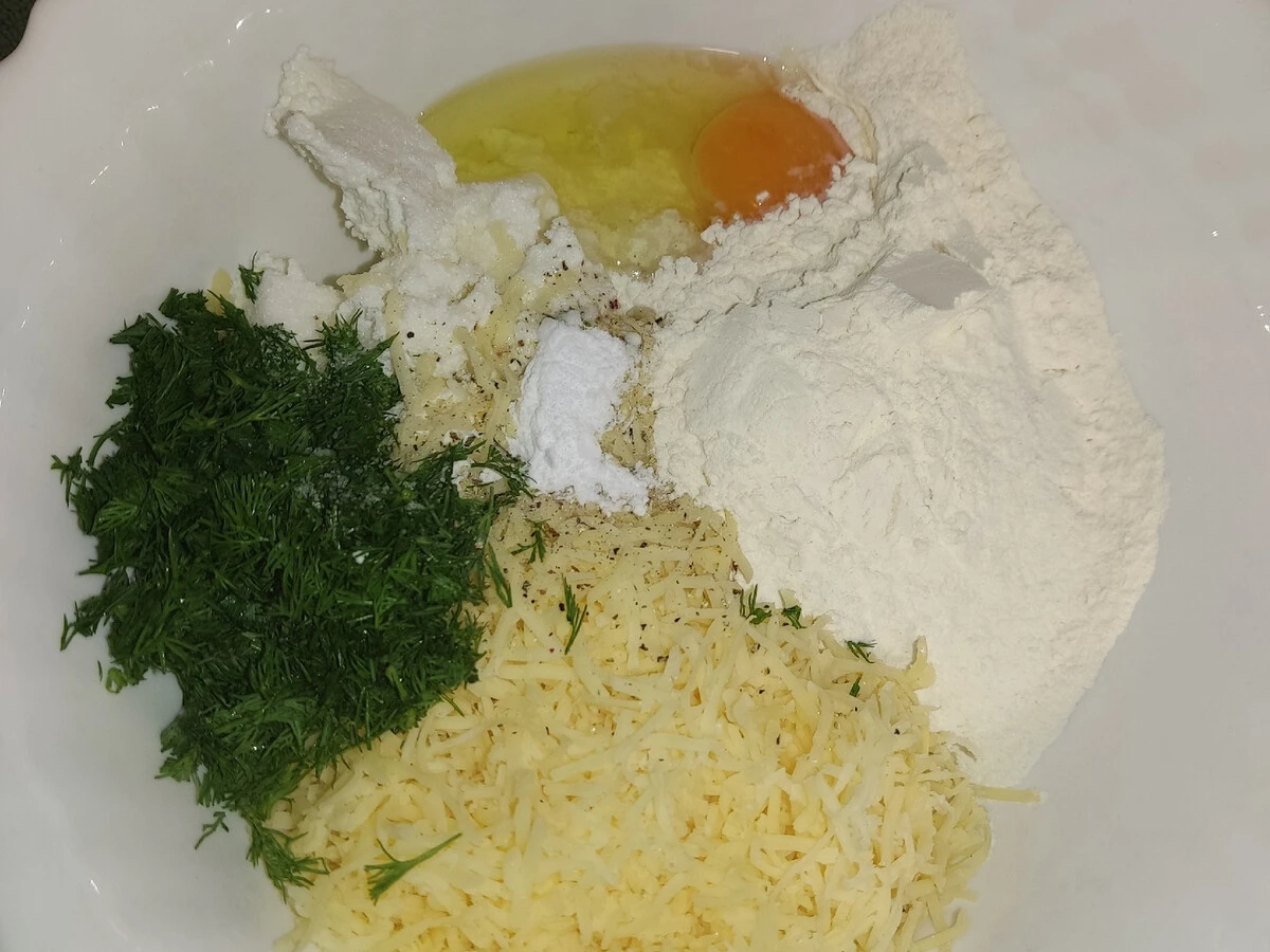 Соедините творог, сыр, муку, яйцо, разрыхлитель. Добавьте любимую свежую зелень, посолите и поперчите. Замесите тесто.