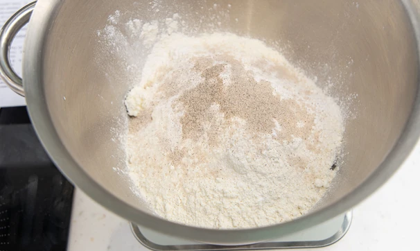 Муку просейте с разрыхлителем через мелкое сито. Перемешивая, добавьте порциями в творожную массу. Тесто получится густым и липким.