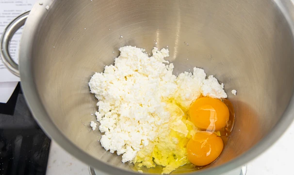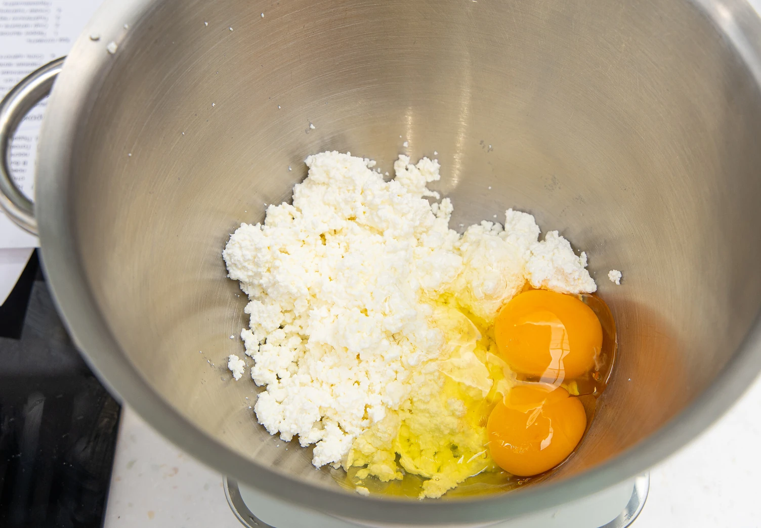 Творог переложите в миску и смешайте с ванильным и обычным сахаром и солью. Добавьте яйца и тщательно перемешайте (можно пробить блендером или взбить на низкой скорости миксером).