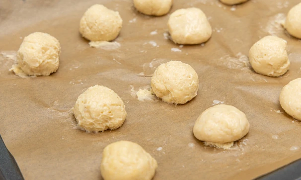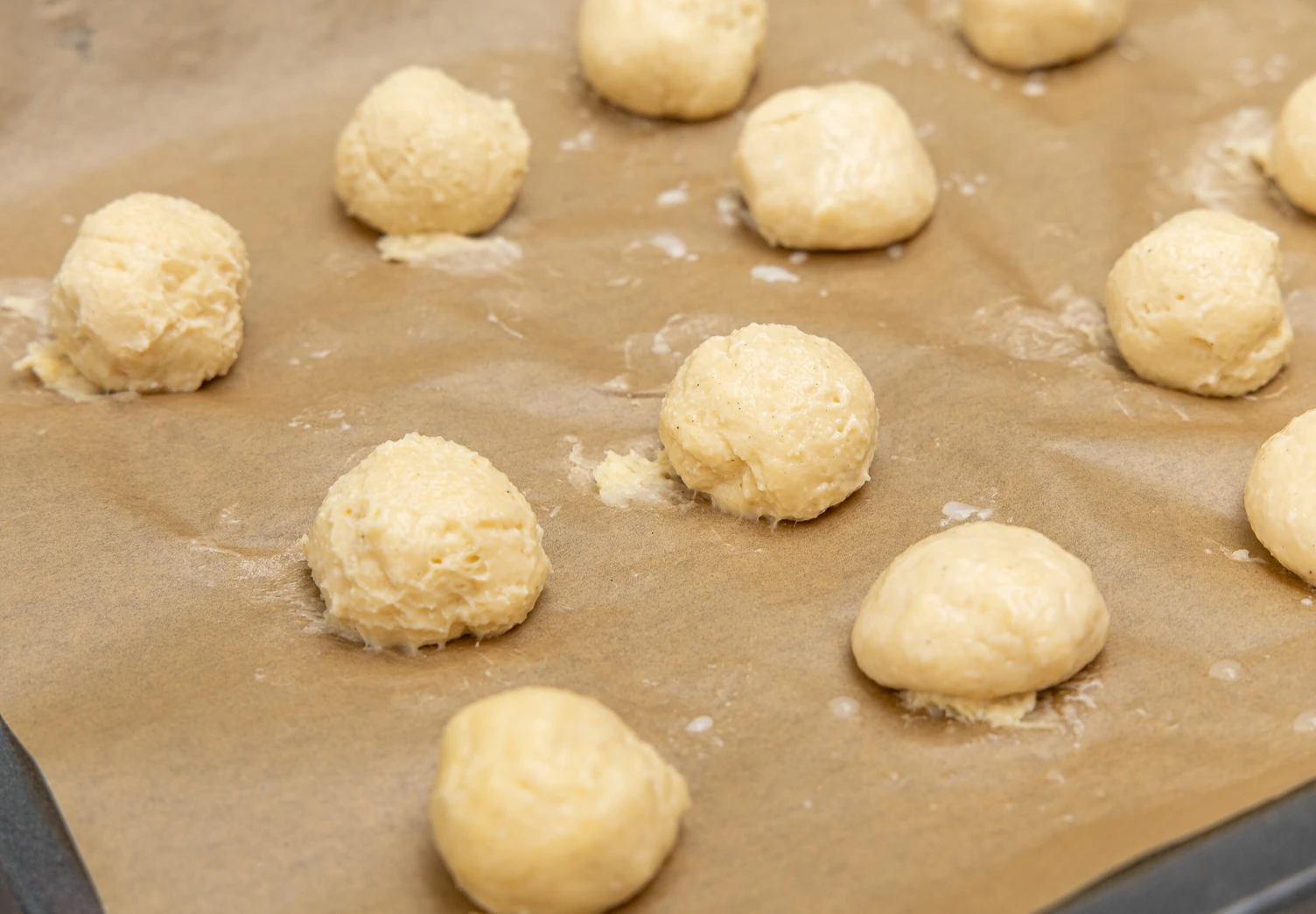 Периодически смачивая руки прохладной водой, сформуйте небольшие круглые булочки и выложите на противень, выстеленный бумагой для выпечки.