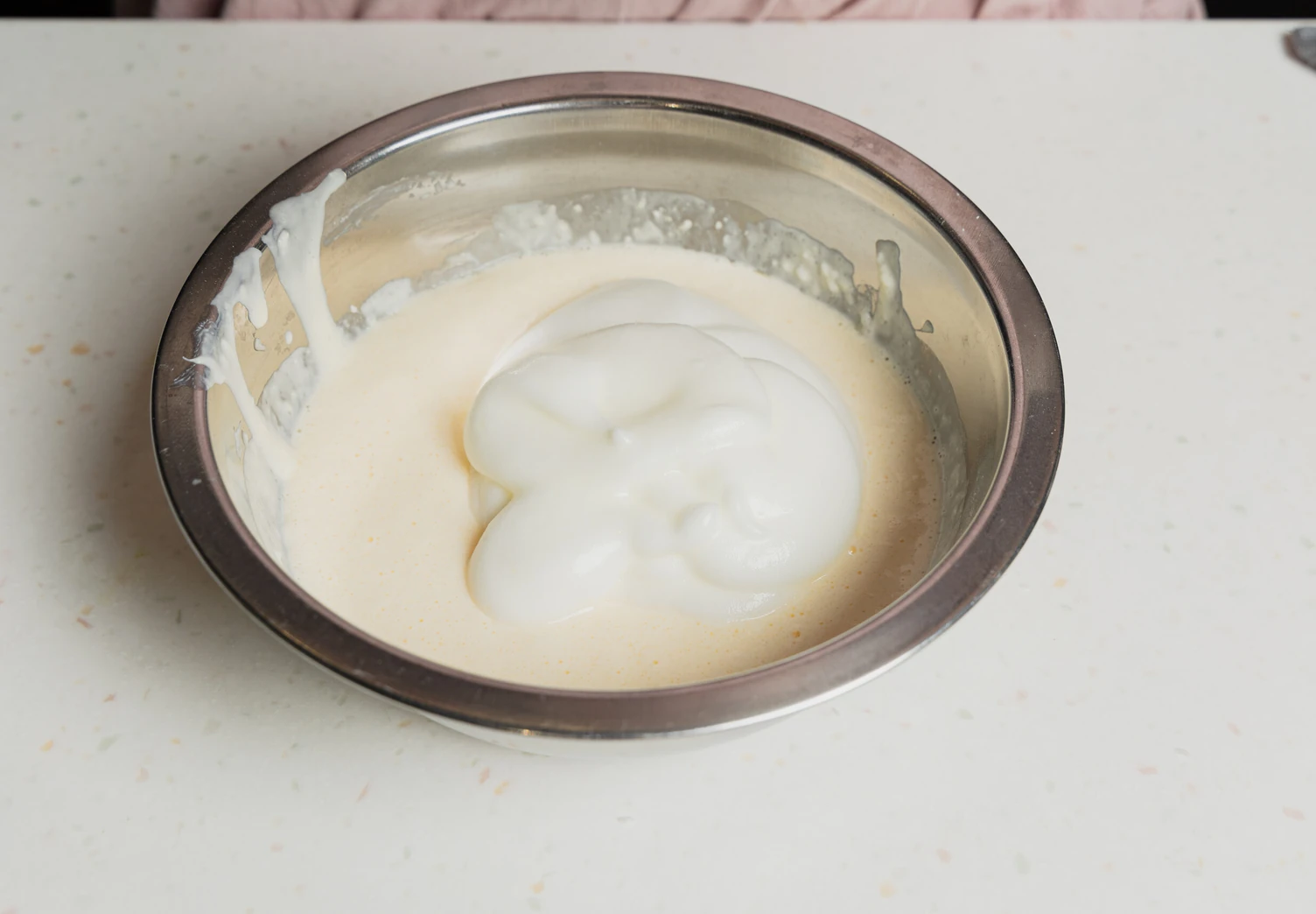 Переложите взбитые белки в миску с творожной массой. Очень аккуратно, плавными движениями снизу вверх, вмешайте их в тесто.