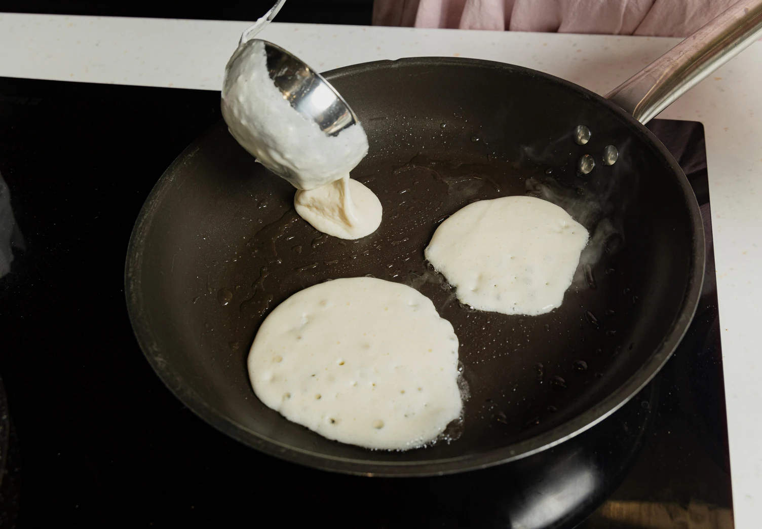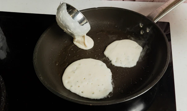 Поставьте антипригарную сковороду с толстым дном и крышкой на медленный огонь и хорошо разогрейте её. Выкладывайте тесто на разогретую сковороду с помощью половника, формируя аккуратные круглые оладьи или небольшие панкейки.