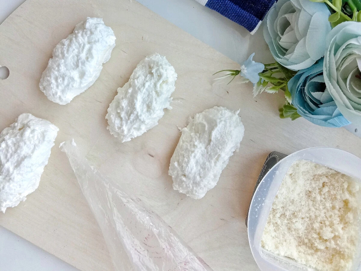 Выложите получившуюся массу в целлофановый пакет, срежьте у него край и отсадите сырки на доску. Уберите в морозилку на час.