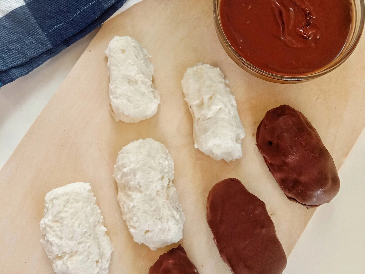 Окуните каждый сырок в глазурь и дайте шоколаду застыть. Так как сырки холодные, это происходит очень быстро.