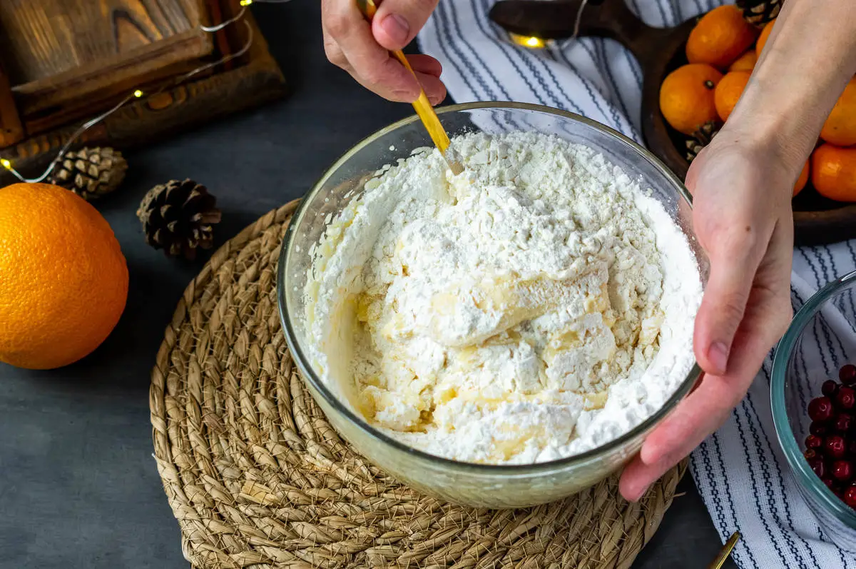 Добавьте просеянную муку двух видов, соль, ванилин, разрыхлитель, перемешайте.