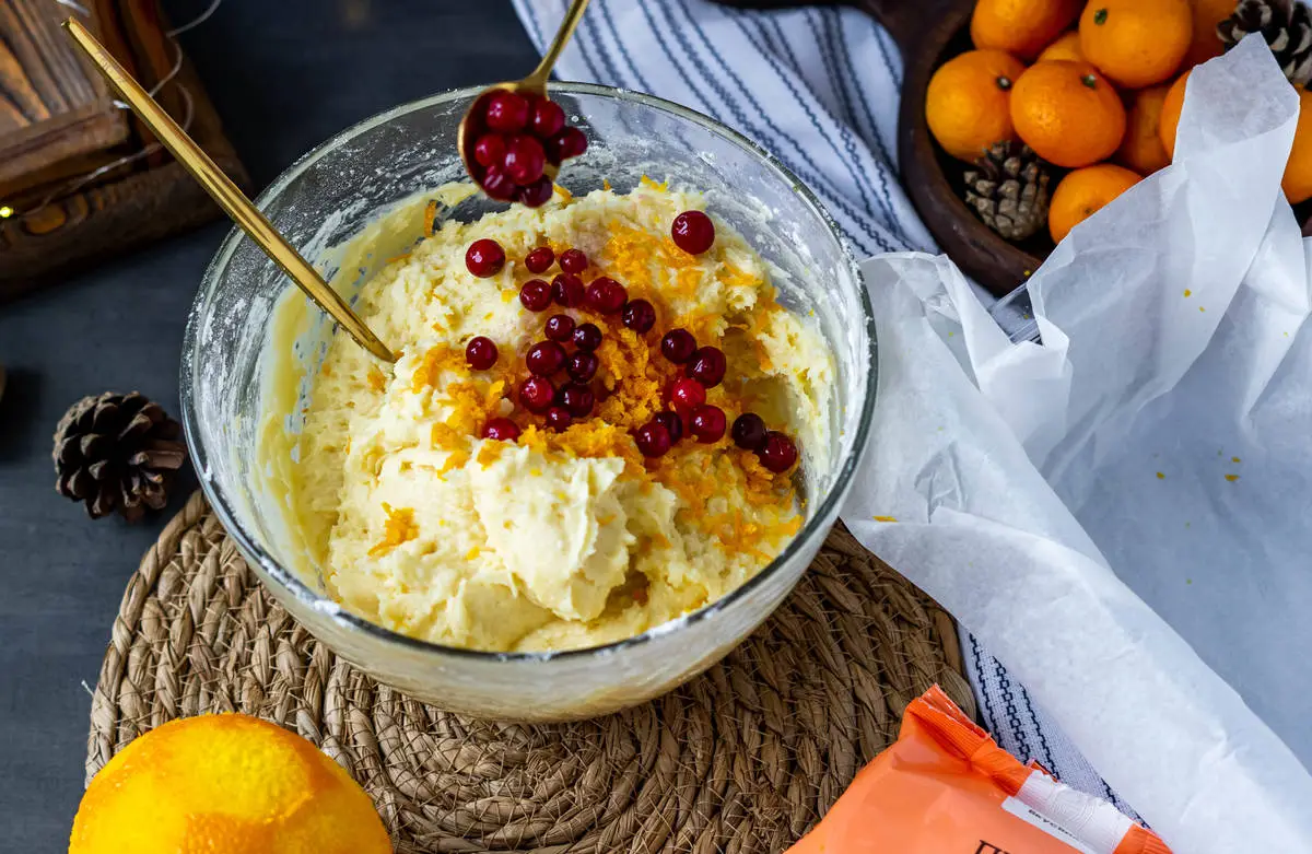 Натрите в тесто цедру, добавьте полностью размороженную клюкву.