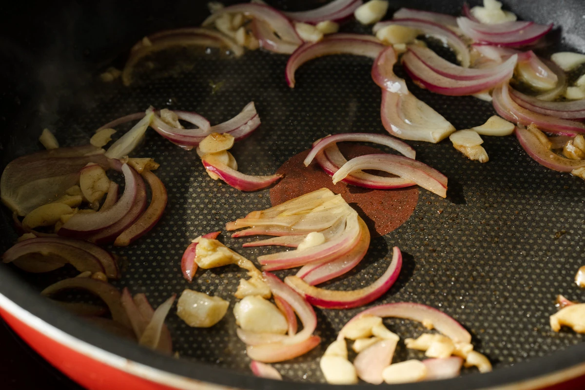 Луч и чеснок мелко нарежьте. Разогрейте в сковороде масло и быстро обжарьте лук с чесноком до зарумянивания. Убавьте огонь, добавьте соевый соус и готовьте до мягкости, помешивая.