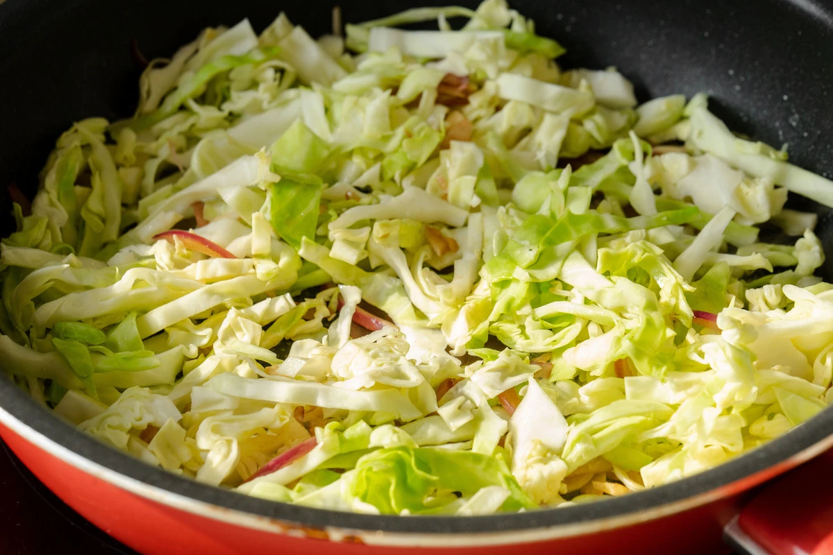 Капусту тонко нарежьте. Добавьте её в сковороду к луку и чесноку и припустите 2-3 минуты. Она не должна обжариться полностью, только слегка стать мягче и обменяться вкусами с ингредиентами в сковороде.