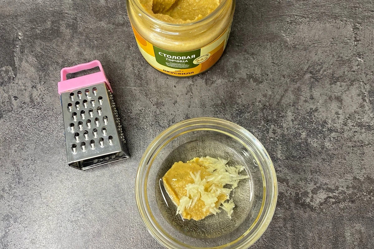 Приготовьте соус. Соедините оливковое масло, горчицу и чеснок и тщательно перемешайте до однородности.