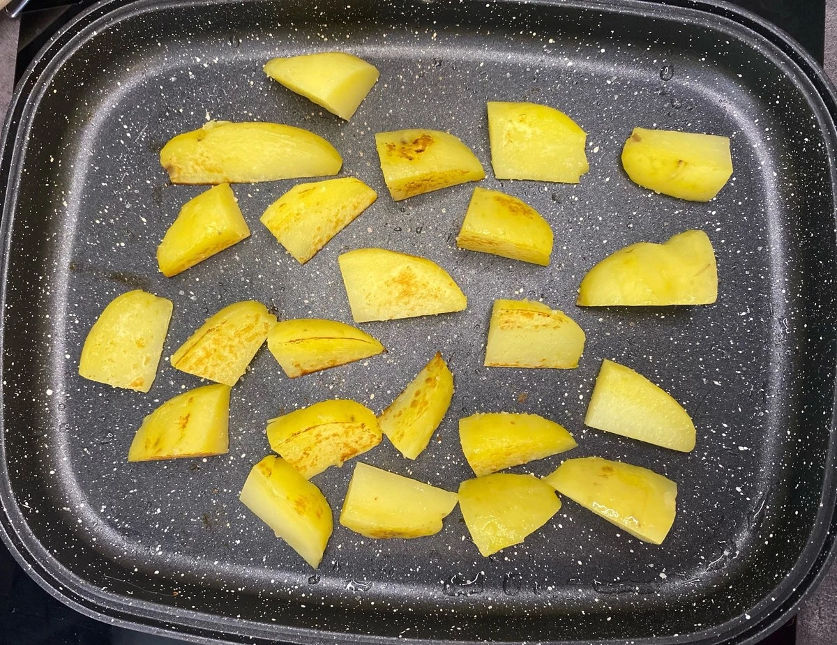 Отварной картофель очистите от кожицы, нарежьте кусочками (мелкий картофель бэби нужно просто разрезать пополам, его для рецепта потребуется в 2 раза больше). Обжарьте на сковороде до румяной золотистой корочки.