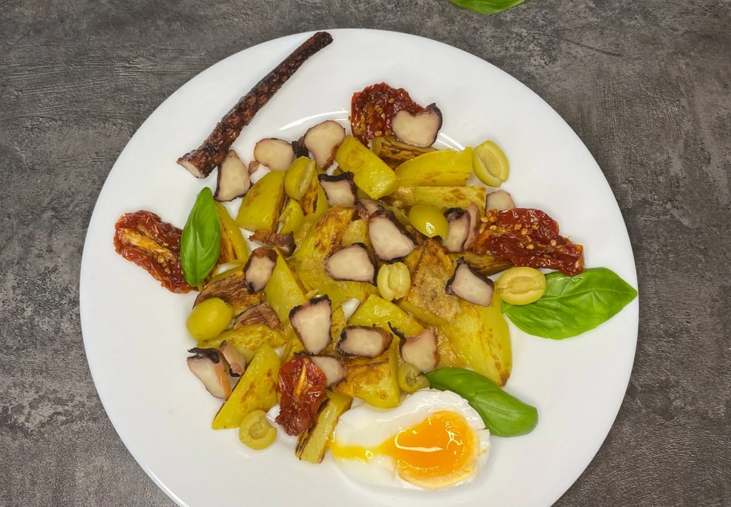 Соберите салат. Обжаренный картофель выложите на тарелку, полейте приготовленным соусом. Сверху поместите кусочки кальмара в произвольном порядке, добавьте оливки, вяленые томаты и листики базилика. Яйцо разрежьте пополам и выложите сверху.