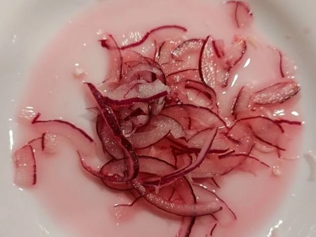 Нарежьте лук тонкими полукольцами и отправьте его мариноваться в лимонном соке или уксусе на 20 минут.