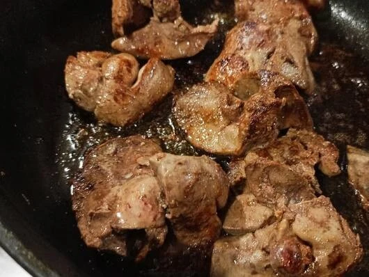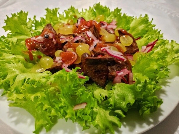 Рецепт «Тёплый салат с куриной печенью, виноградом и луком»