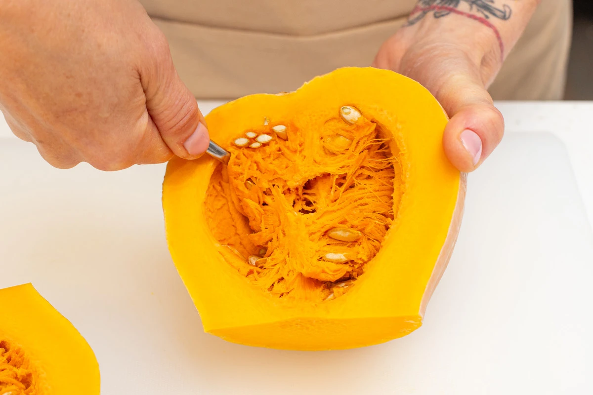Тыкву помойте, очистите от семечек. Для этого рецепта лучше брать круглую тыкву или часть с семенами продолговатой тыквы сорта баттернат.