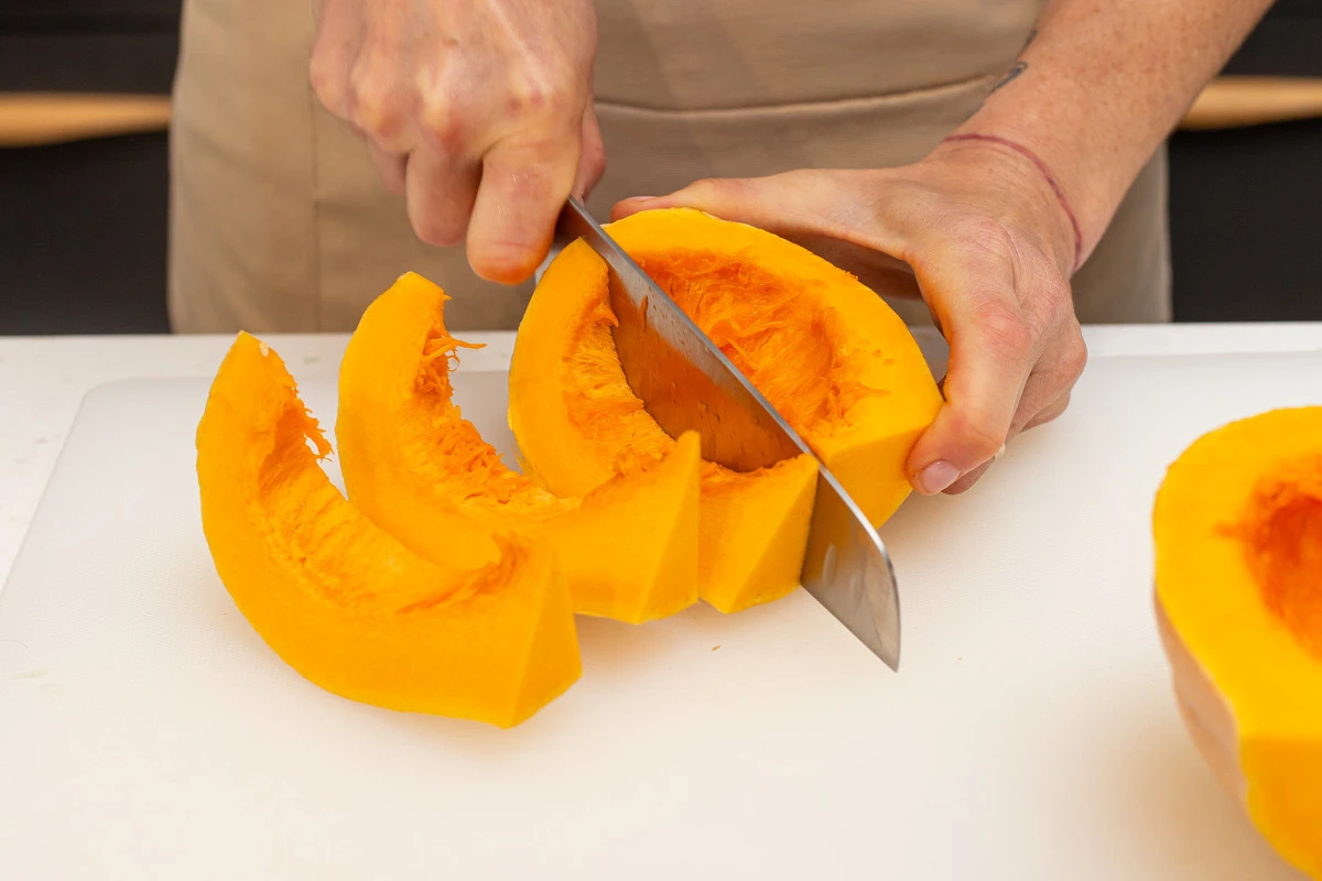 Нарежьте тыкву ломтиками толщиной примерно 2 см в основании, для этого рецепта её можно не чистить.