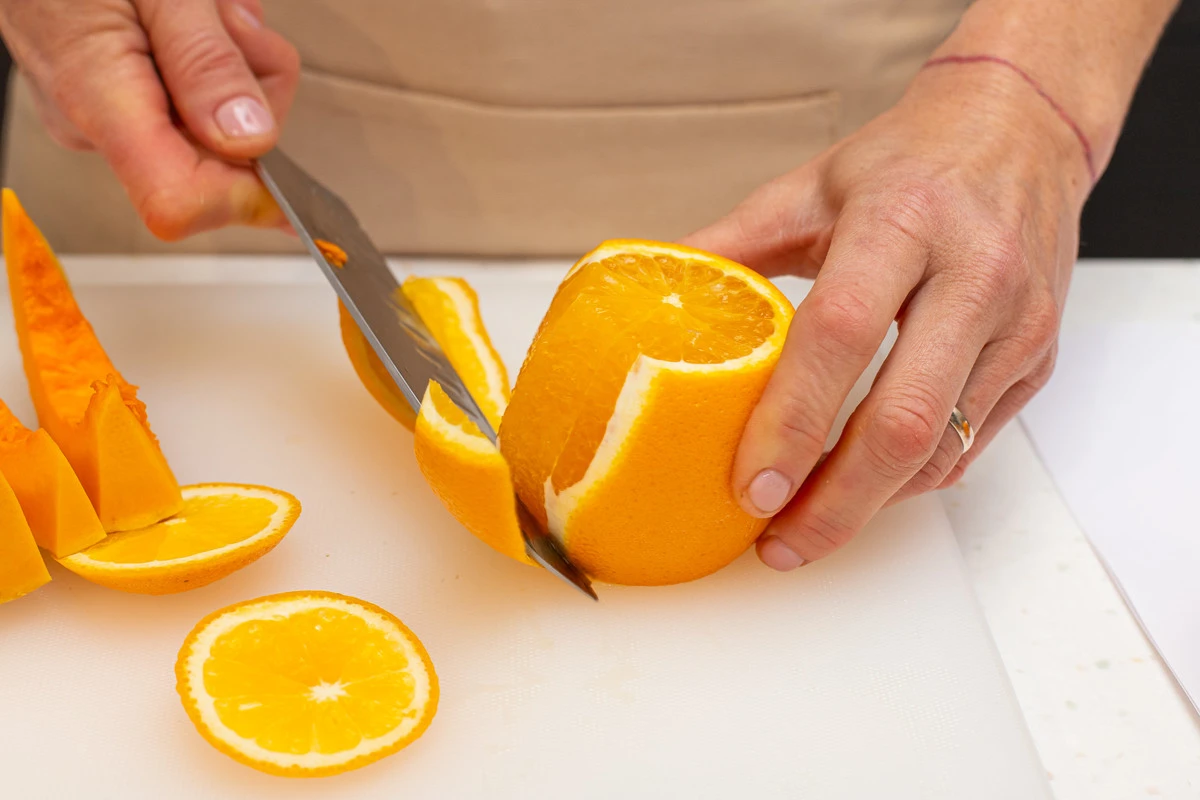Апельсины помойте. Ножом очистите апельсины от кожуры и вырежьте дольки так, чтобы на них не было белых плёнок.