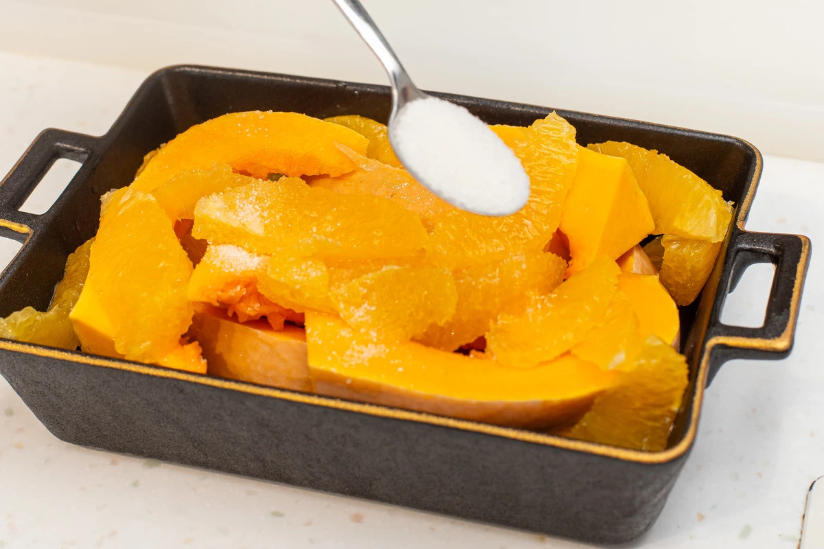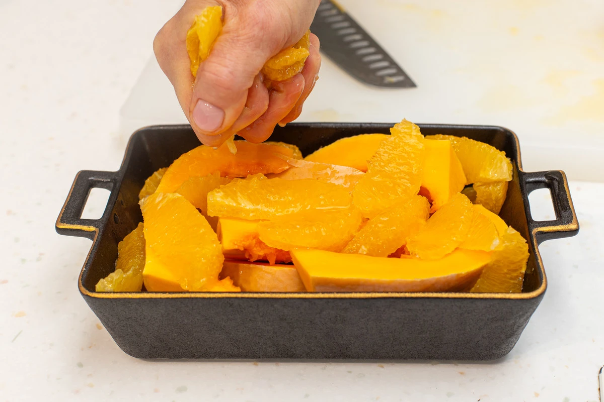 Выложите в форму для запекания дольки тыквы и апельсина. Сверху выдавите сок из оставшейся мякоти апельсина (из которой вырезали дольки).