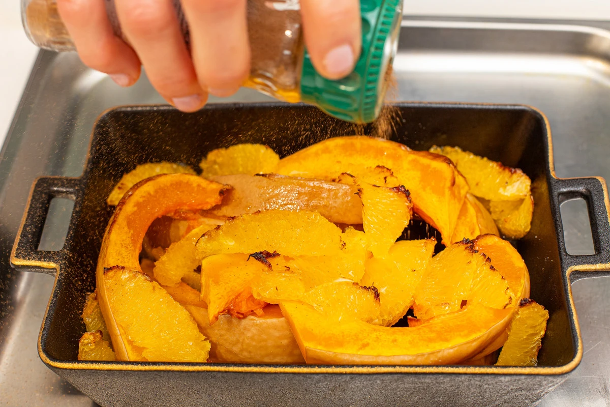 По готовности посыпьте тыкву с апельсинами молотой корицей.