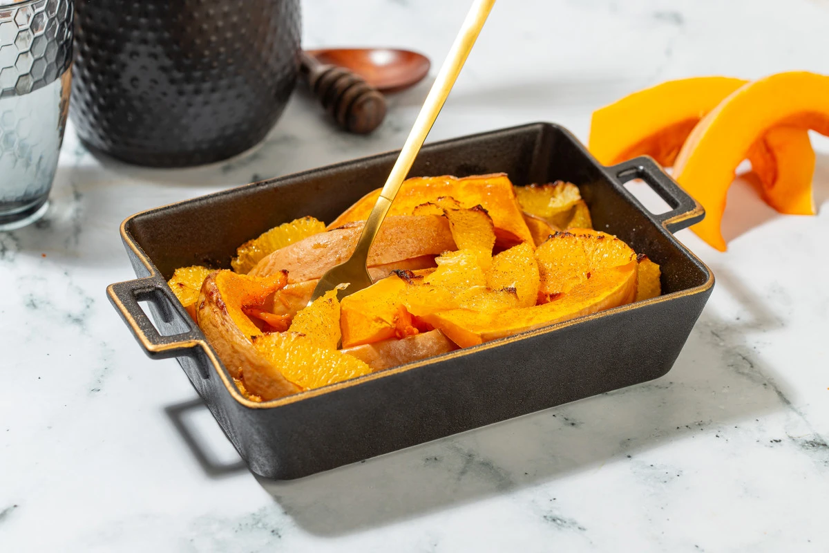 Запечённые в духовке ломтики тыквы с апельсином, небольшим количеством сахара и корицей станут оригинальным гарниром к птице — например, утке — или самостоятельным перекусом, полдником.