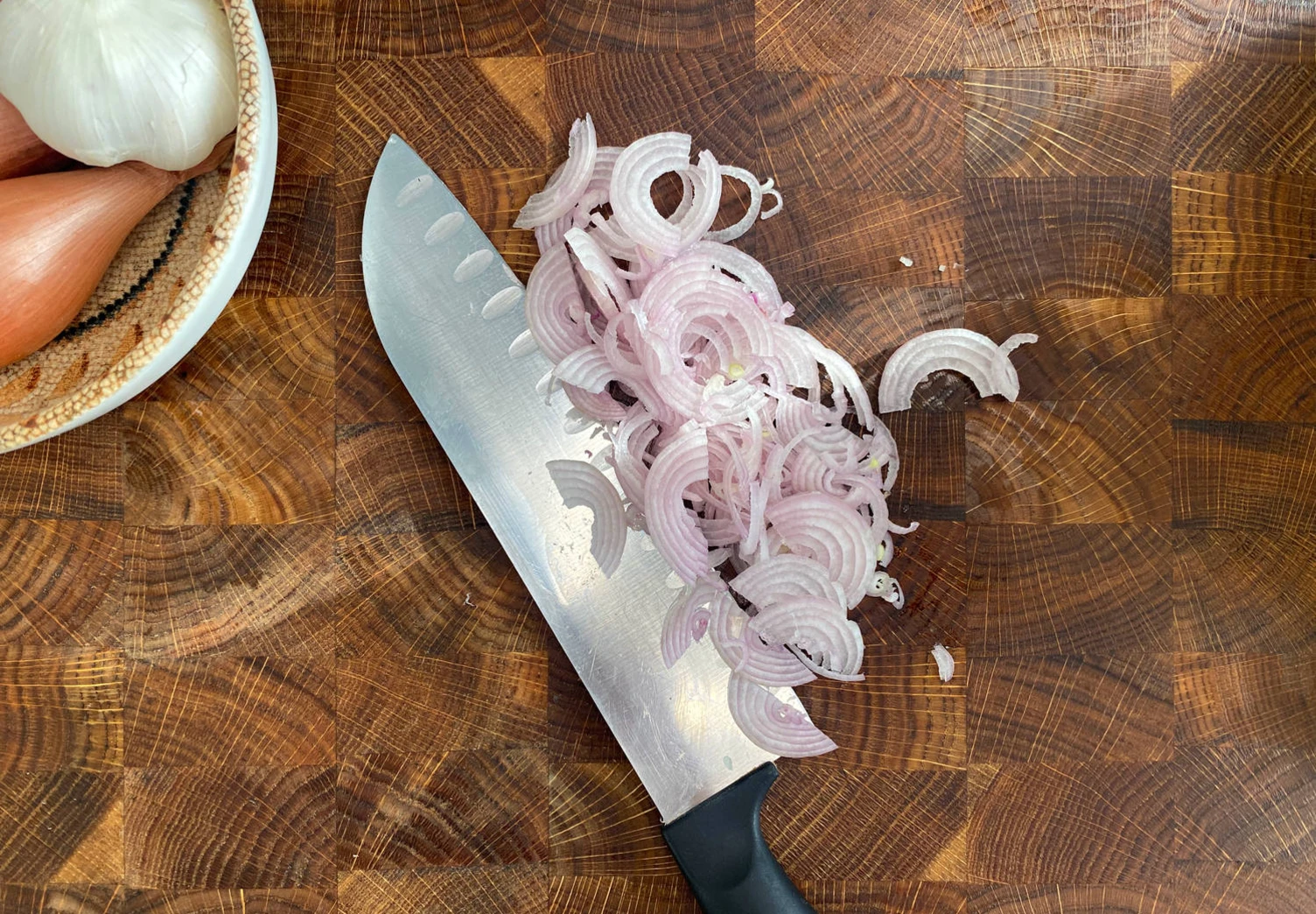Нарезпть тонкими полукольцами одну крупную луковицу.