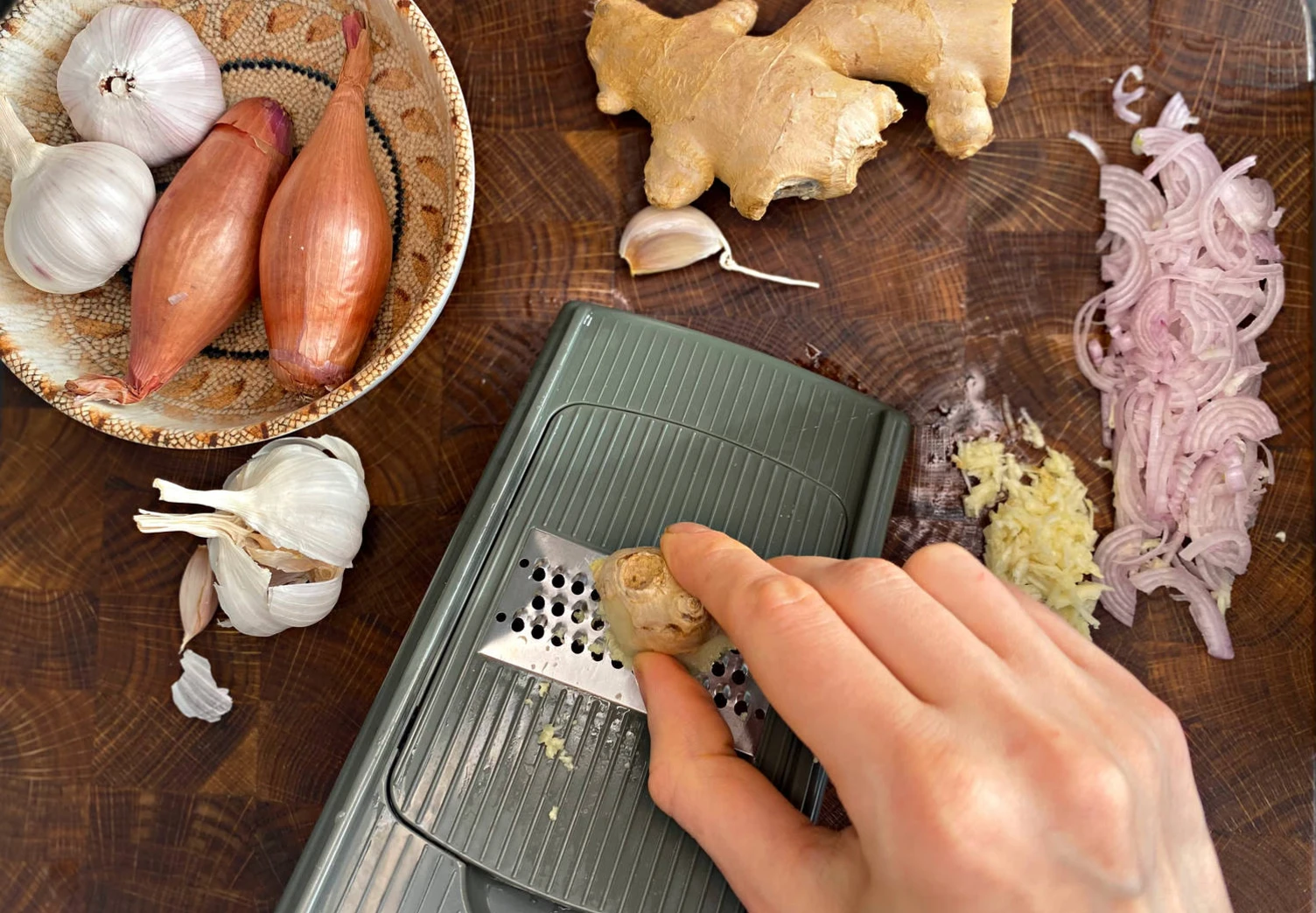 Измельчить 5 зубчиков чеснока и натереть корень имбиря. Приблизительно по столовой ложке с горкой каждого измельчённого ингредиента.