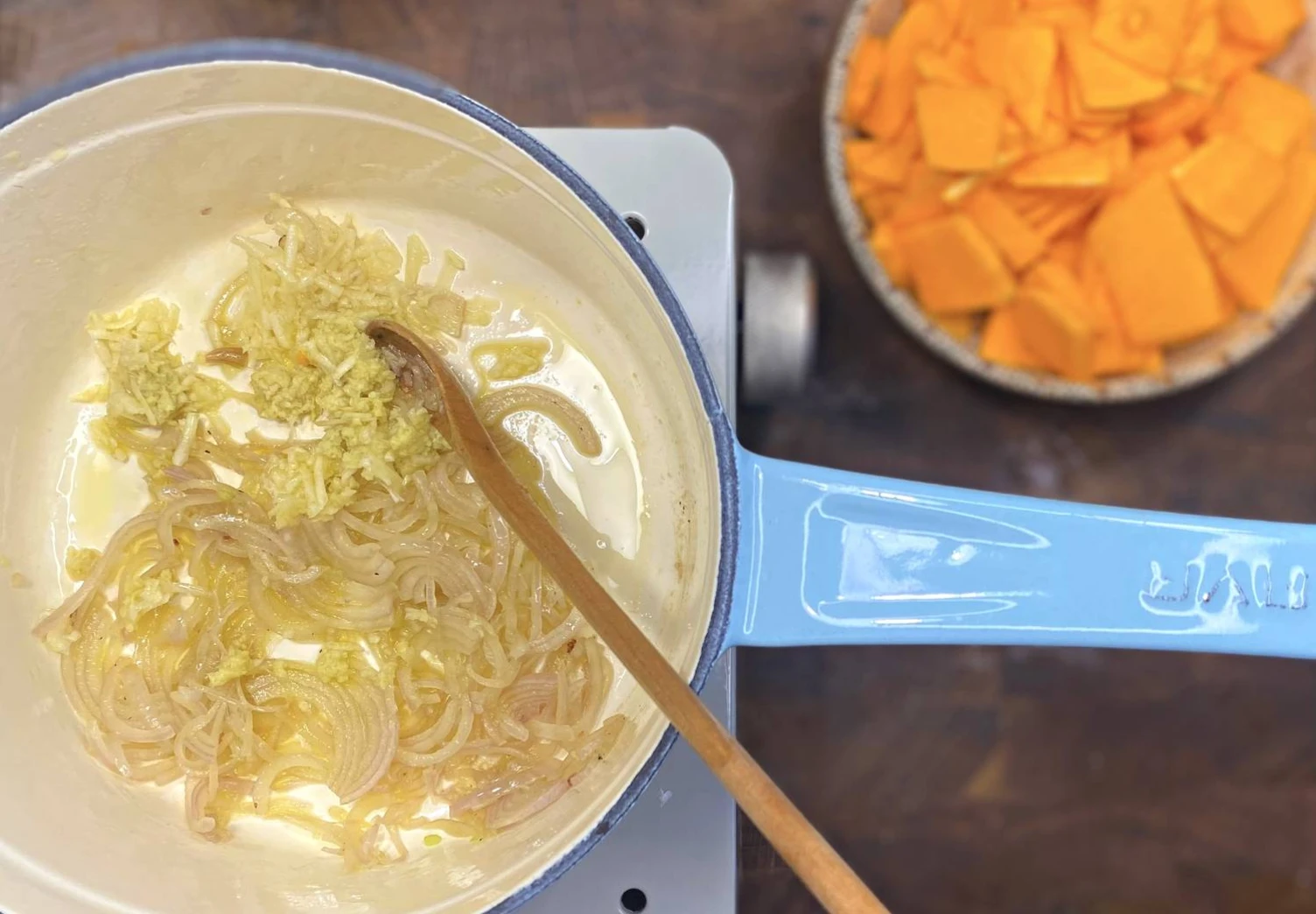 Средний огонь. В сотейнике с толстым дном на смеси оливкового и сливочного масла пассеруйте лук до мягкости около трёх минут. Добавьте чеснок и имбирь.