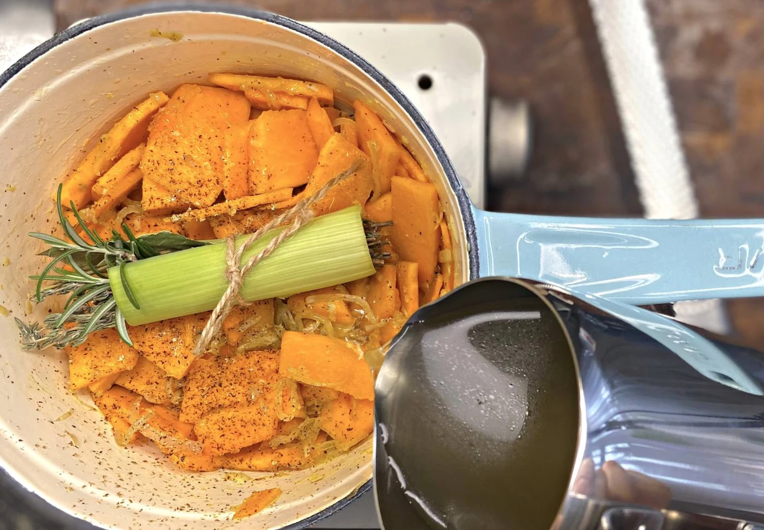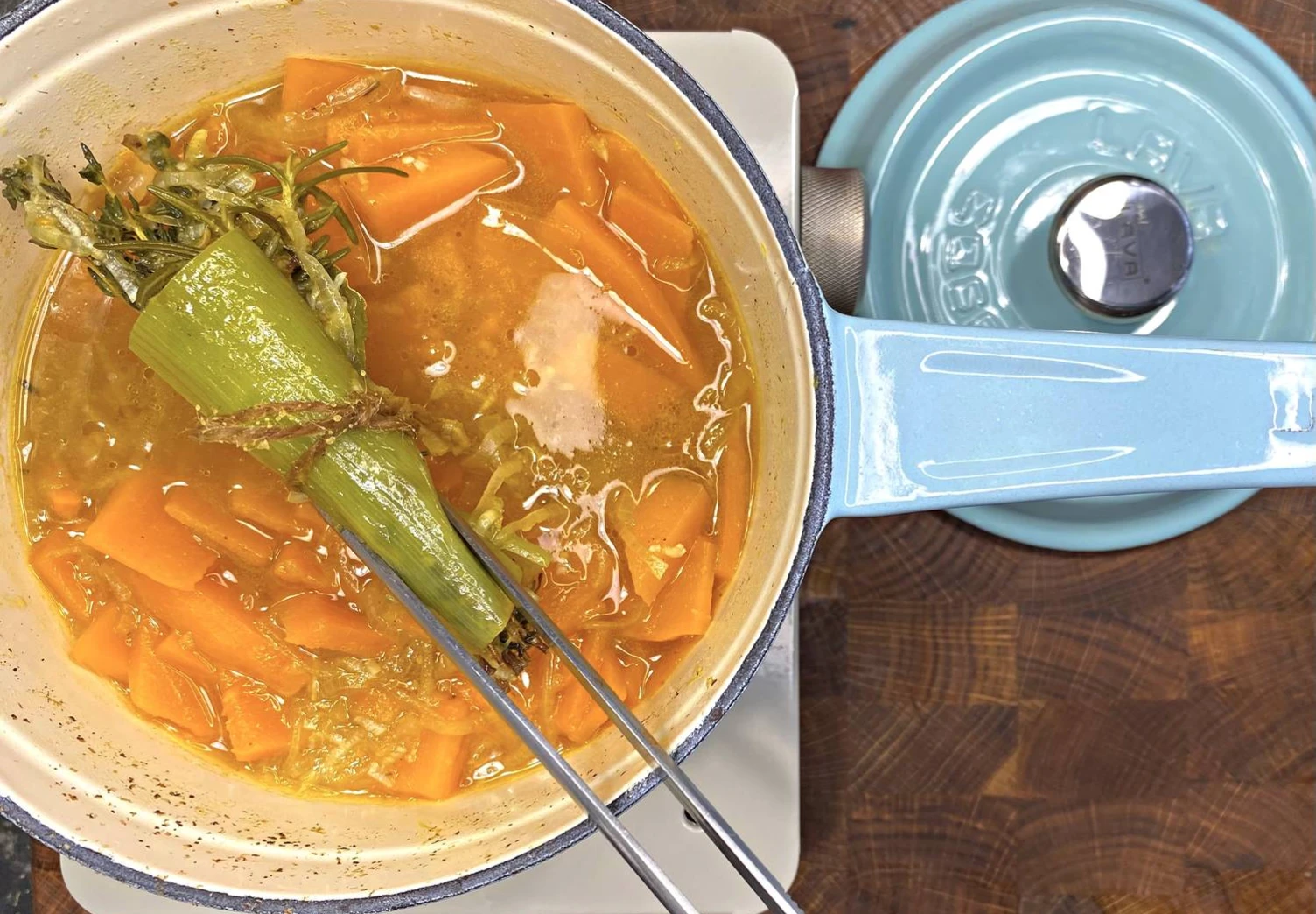 Две-три минуты прогрейте тыкву, затем добавьте бульон и букет «гарни». *для удобства поместите ароматные травы внутрь трубочки лука-порея и перевяжите кулинарной нитью. Варить 20 минут на среднем огне под крышкой.
