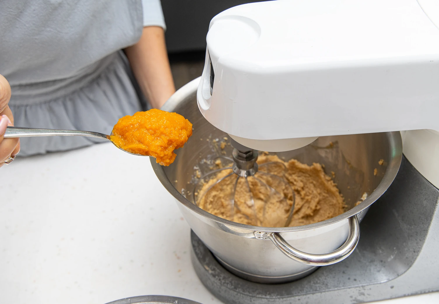 Добавьте тыквенное пюре и яичные желтки, не переставая взбивать.