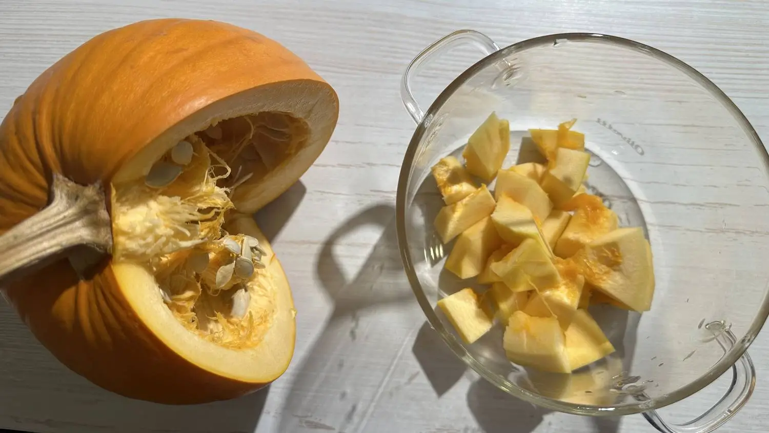 Нарезать тыкву и поставить вариться с минимальным количеством воды (около 40 мл) до размягчения.