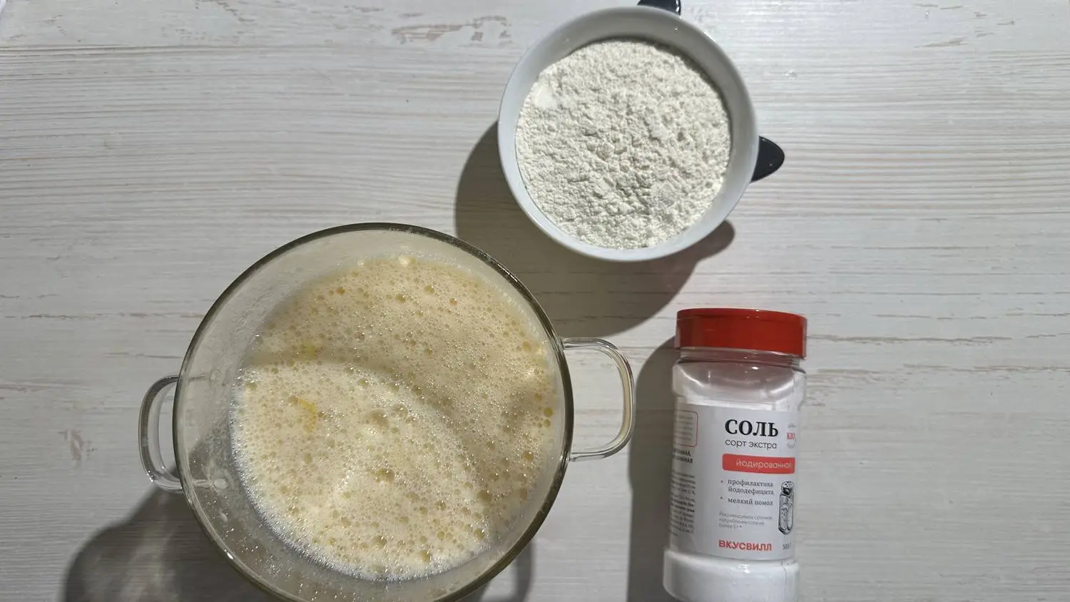 Добавить муку и соль. Всё хорошо перемешать. Тесто должно быть по консистенции похоже на кефир.