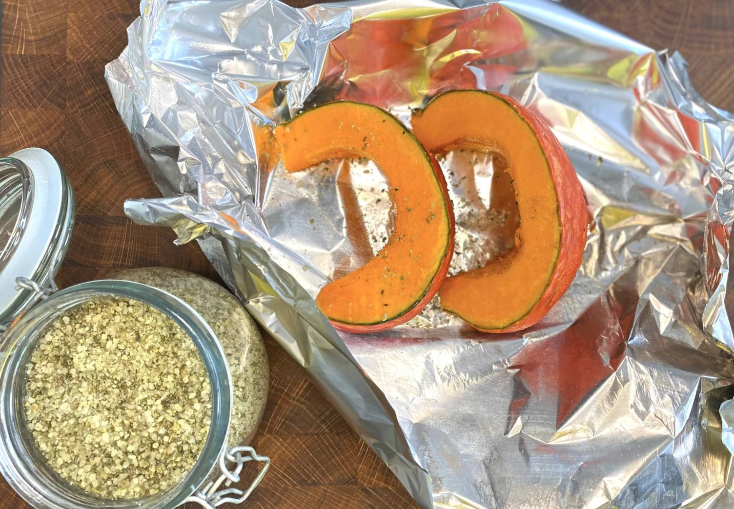 Вымытую, обсушенную, нарезанную тыкву посолить, завернуть в фольгу и запекать один час при температуре 200°. Здесь и далее я буду использовать соль со свежим шалфеем.