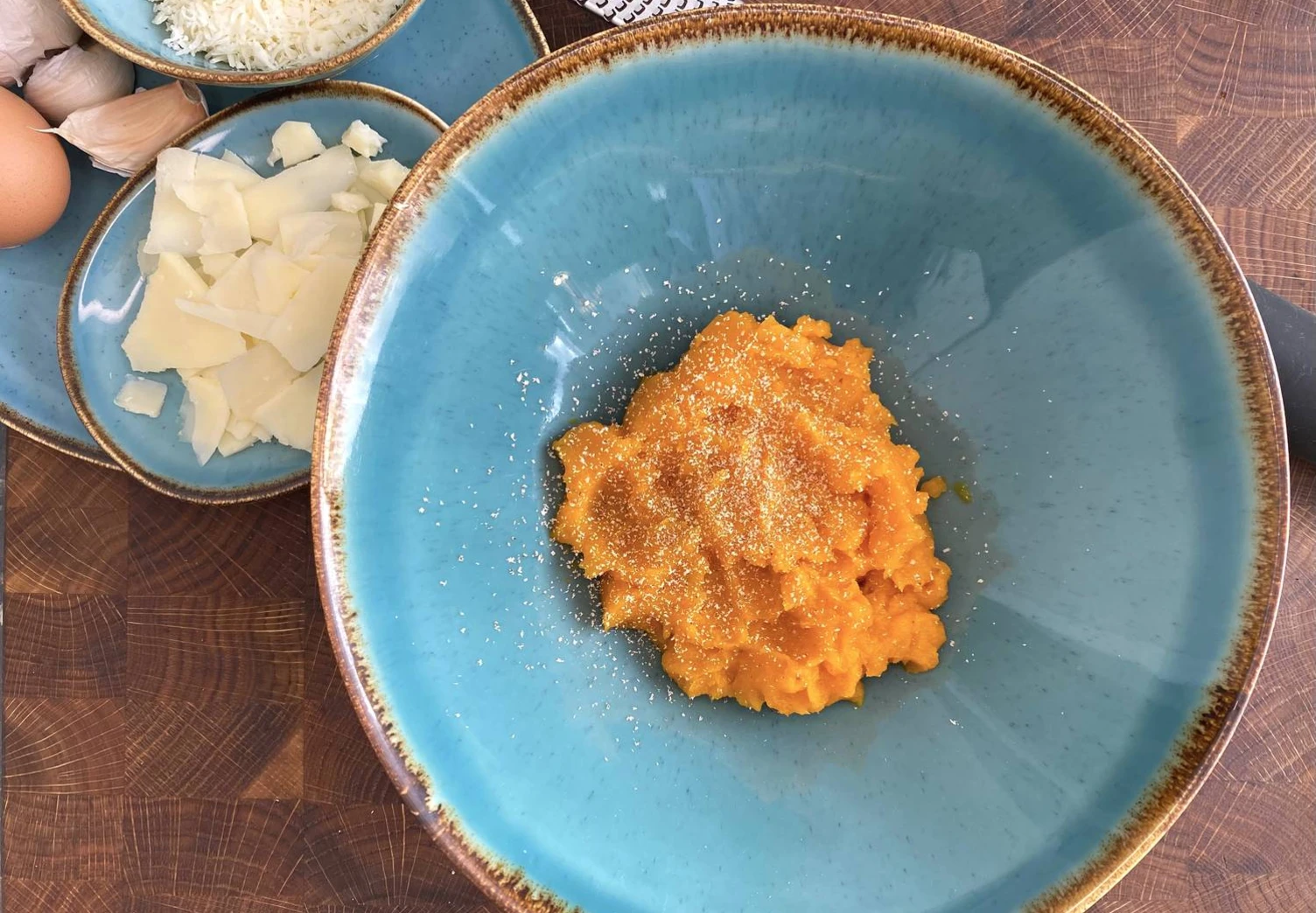 Ложкой отделите мякоть от кожуры. Измельчите тыкву в блендере или картофельном прессе до консистенции гладкого пюре.