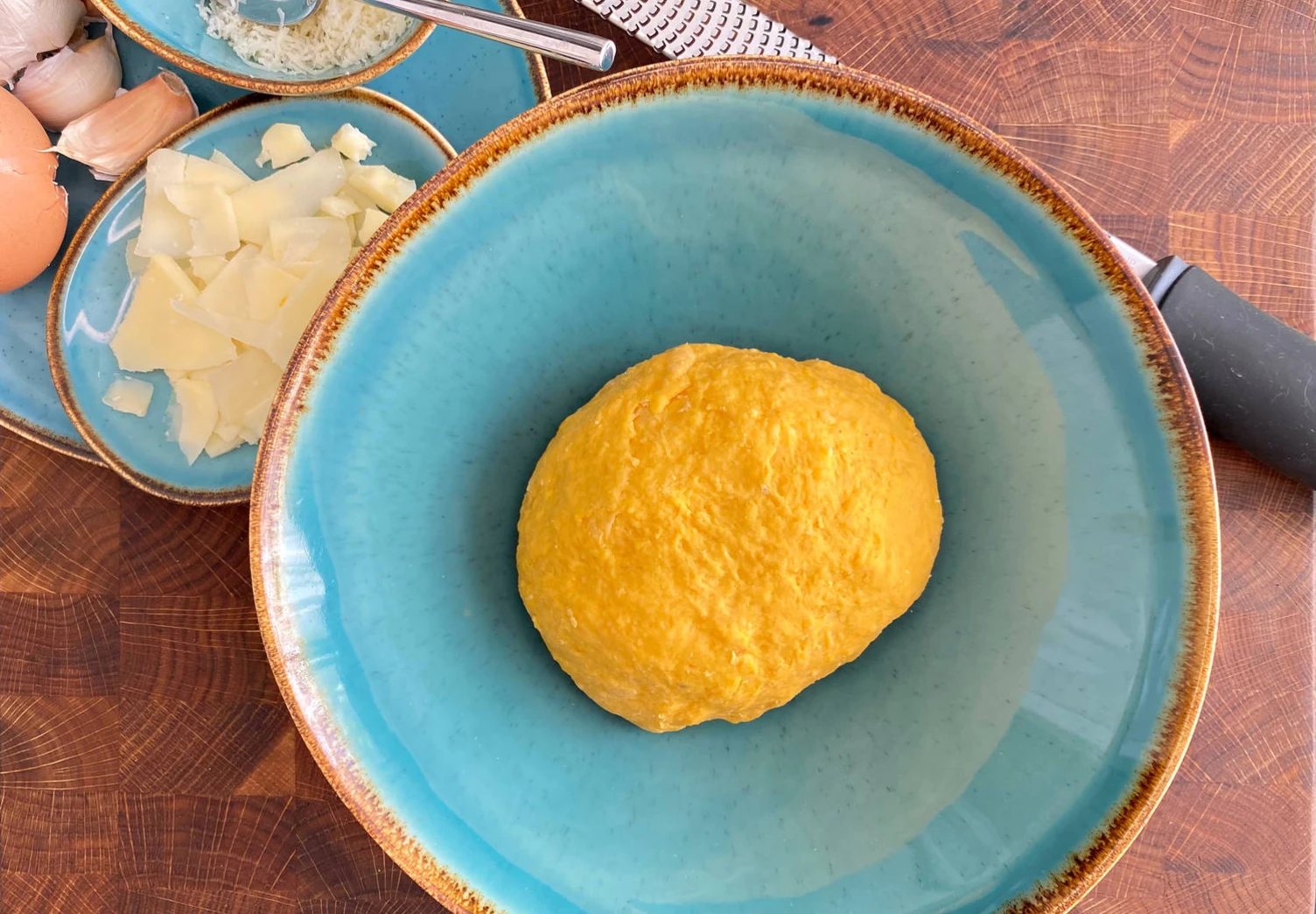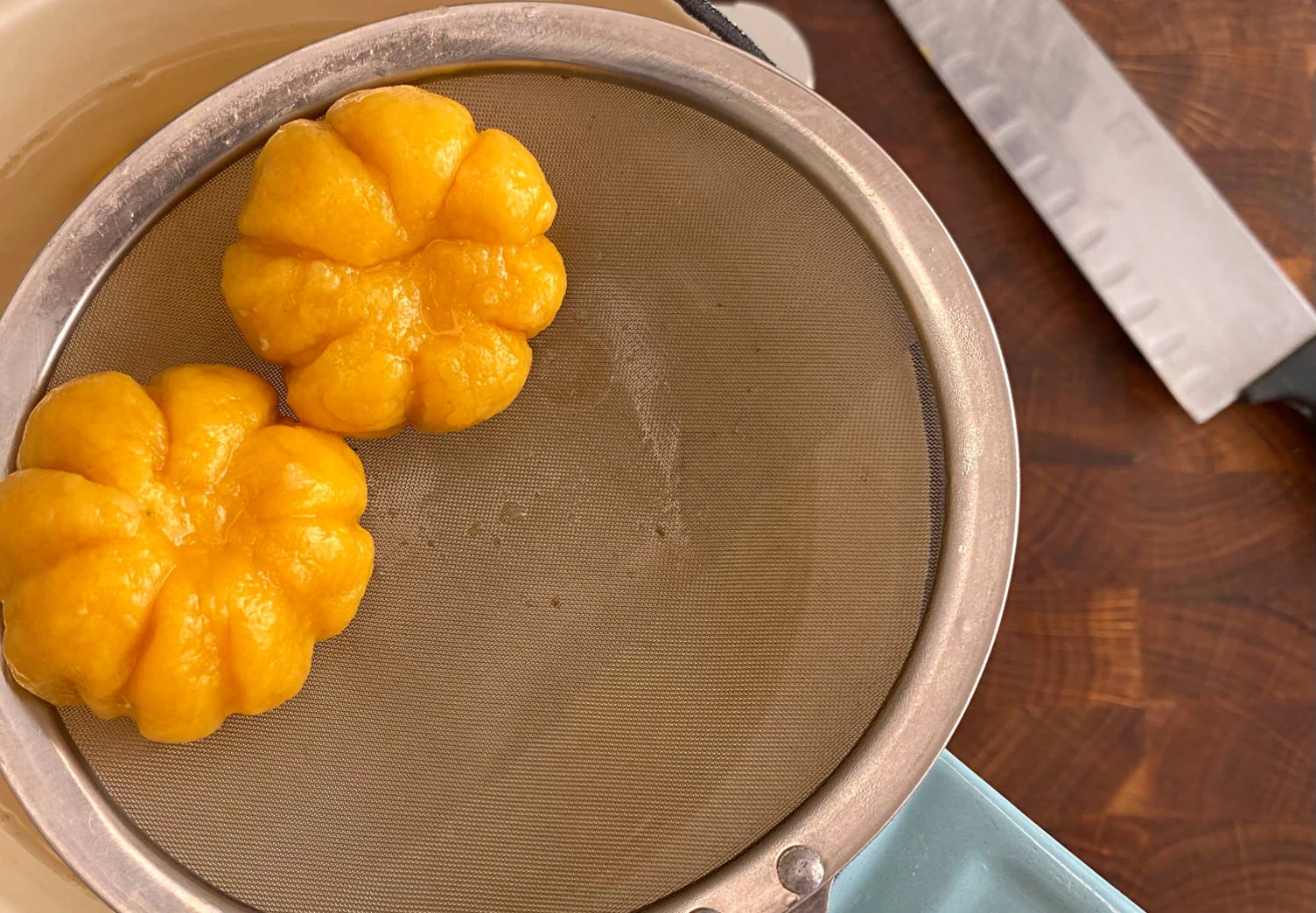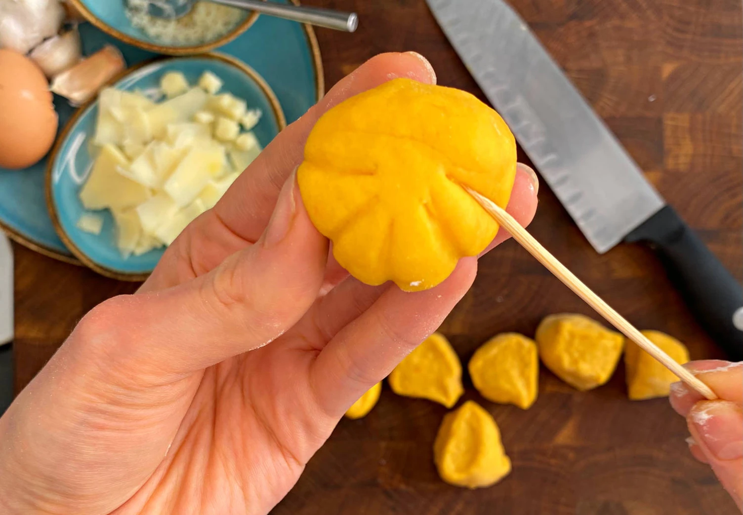 Поставьте закипать чуть подсоленную воду. Сухими, чуть припудренными мукой руками скатайте шарик и шпажкой, зубочисткой или неострой стороной ножа сформируйте тыквенные дольки, надавливая и прокатывая шпажку «от полюса к полюсу».