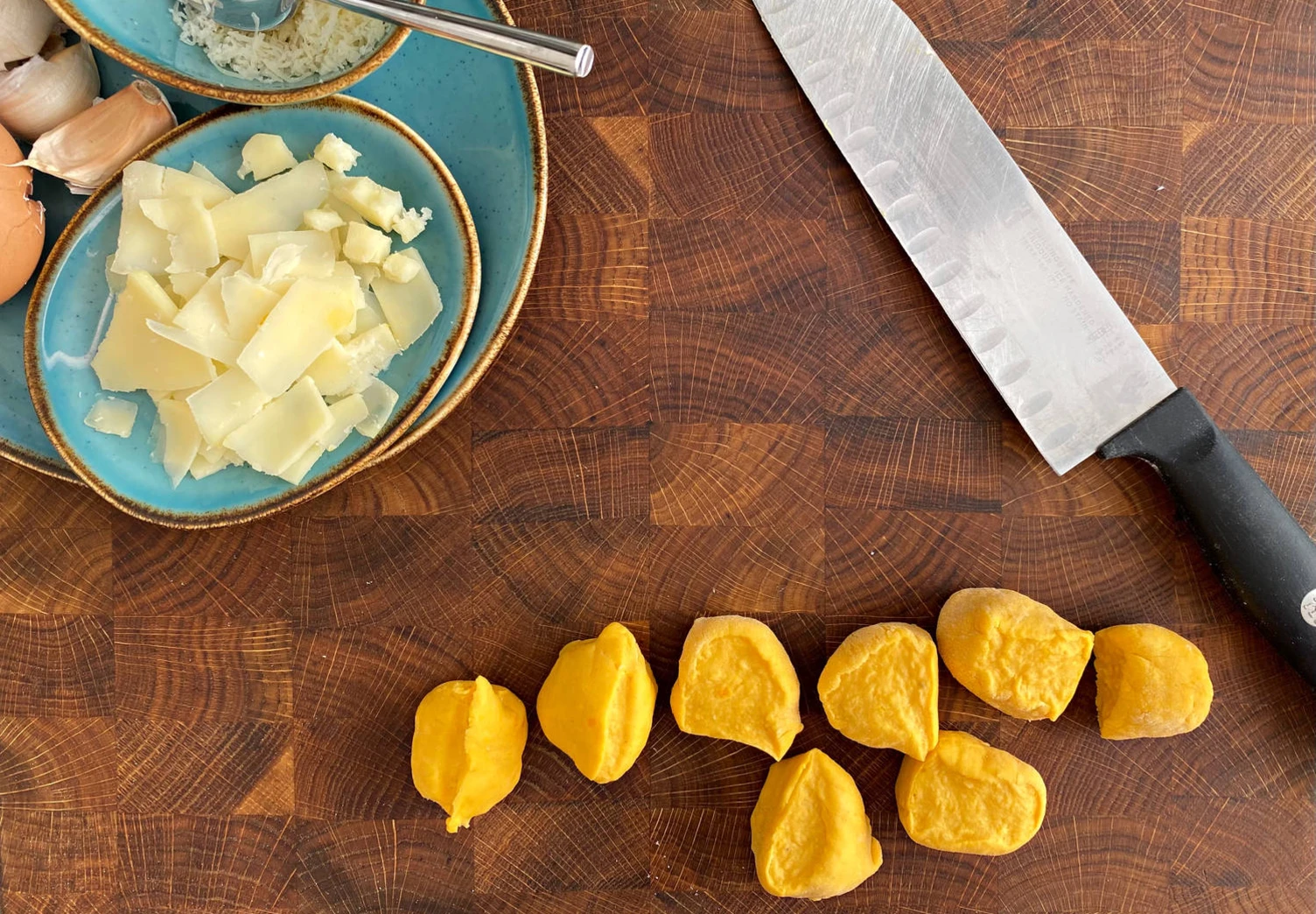 Опуская тыковки в кипящую воду, следите, чтобы ньокки не прилипали ко дну. Варите 5-7 минут. Поскольку ньокки получаются объёмными и тяжёлыми, они не всплывут на поверхность, как клёцки. Зато будут подпрыгивать и переворачиваться, отталкиваясь от дна. Ориентируйтесь на эти кувырки для определения степени готовности.