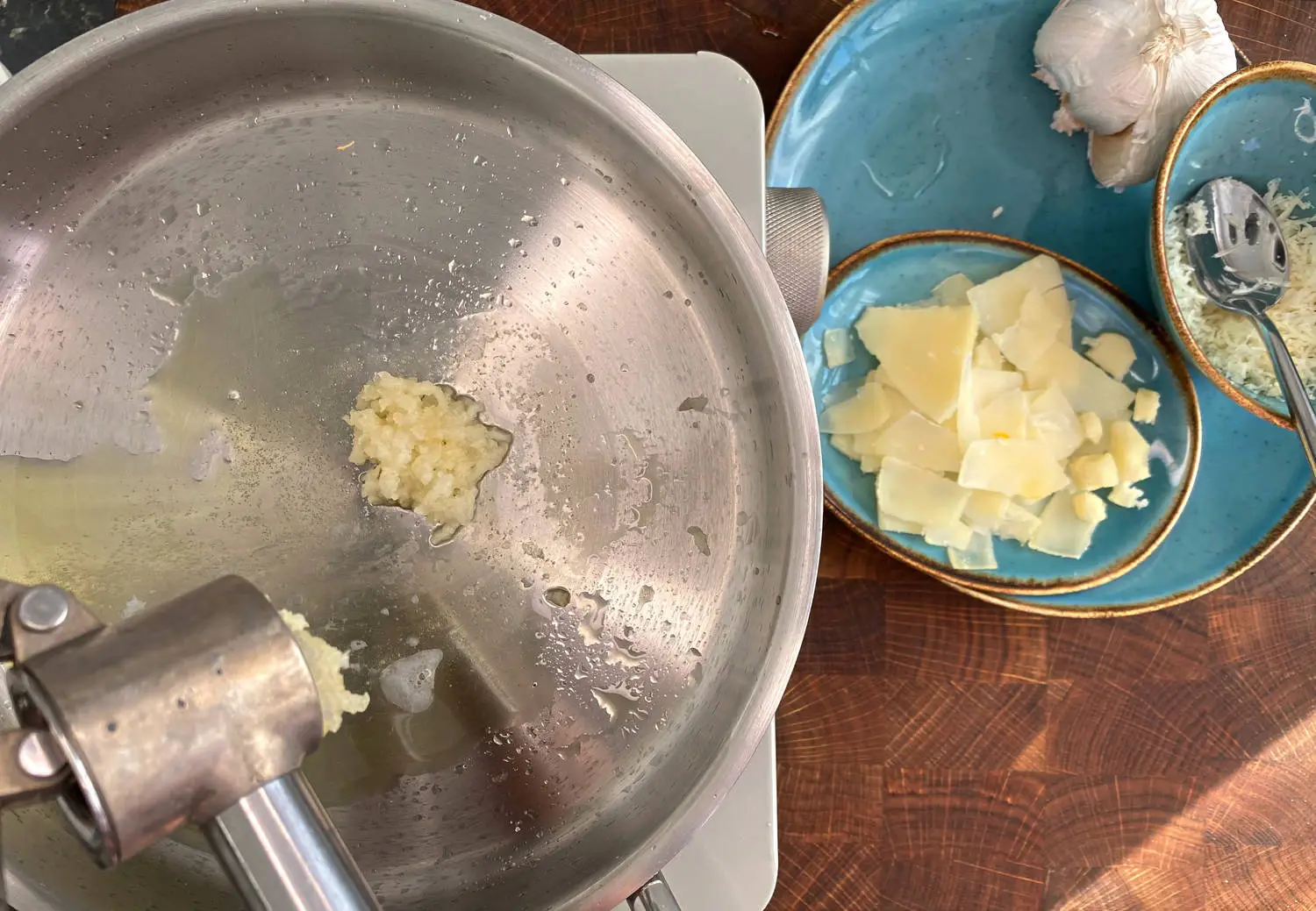 Средний огонь. На смеси сливочного и оливкового масла прогрейте одну измельчённую головку чеснока до появления аромата.