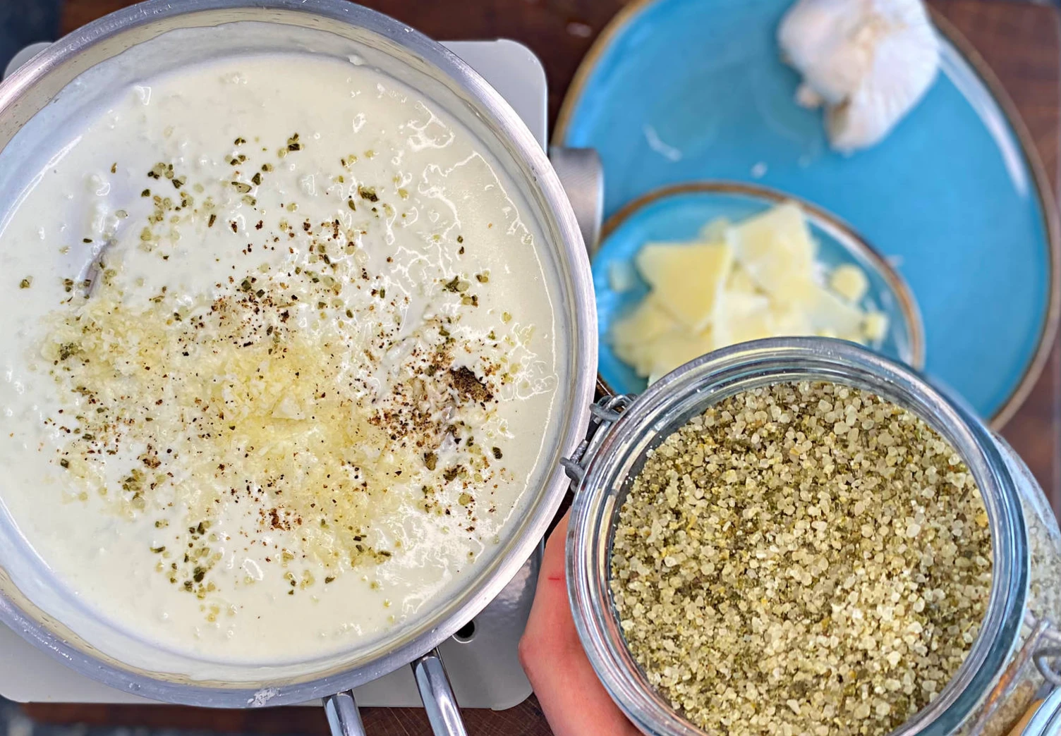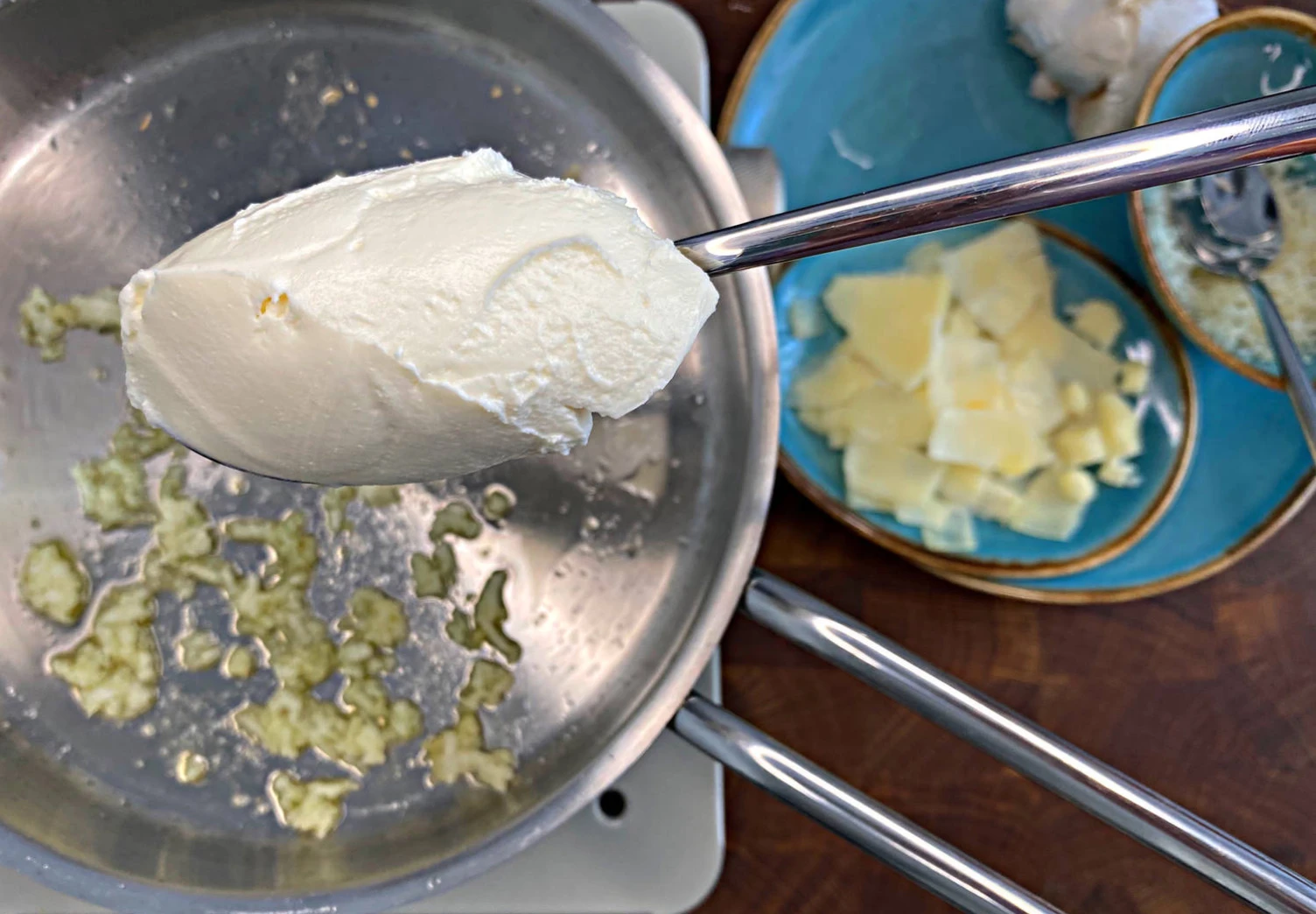 Добавьте 200 мл сливок. Вариант для таких же худеющих, как я: столовая ложка лёгкого сливочного сыра +150 мл обезжиренного молока.