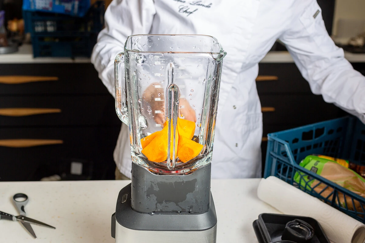 Тыкву нарежьте кубиками среднего размера и положите в кувшин блендера. Если хотите, чтобы ингредиенты быстрее измельчились или у вас не очень мощный блендер, лучше нарезать помельче.