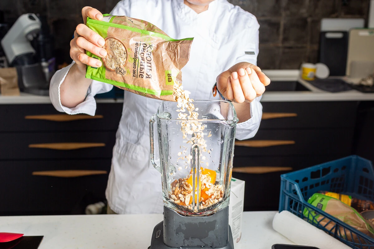 Всыпьте овсяные хлопья. Чем более густой смузи вы хотите получить, тем больше хлопьев добавляйте — от 20 до 100 г. Можете засыпать овсянку постепенно, измельчая ингредиенты и смотря на консистенцию напитка.