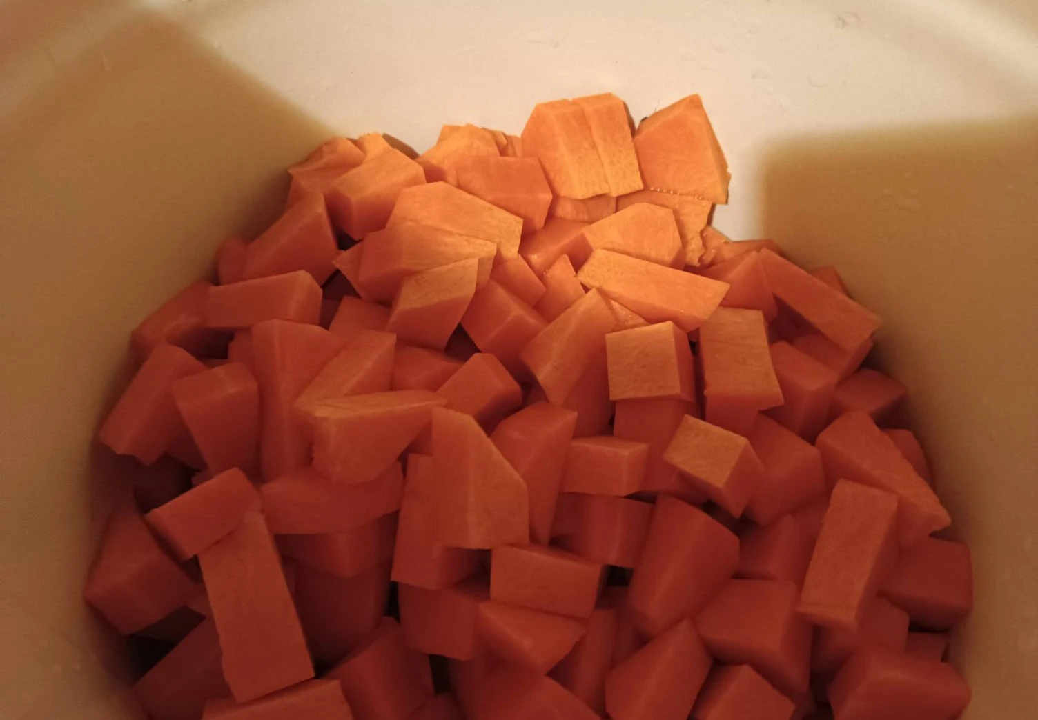 Очищенную тыкву режем на кусочки приблизительно по 3 см. Заливаем 1,5 литрами воды и варим до мягкости минут 40.