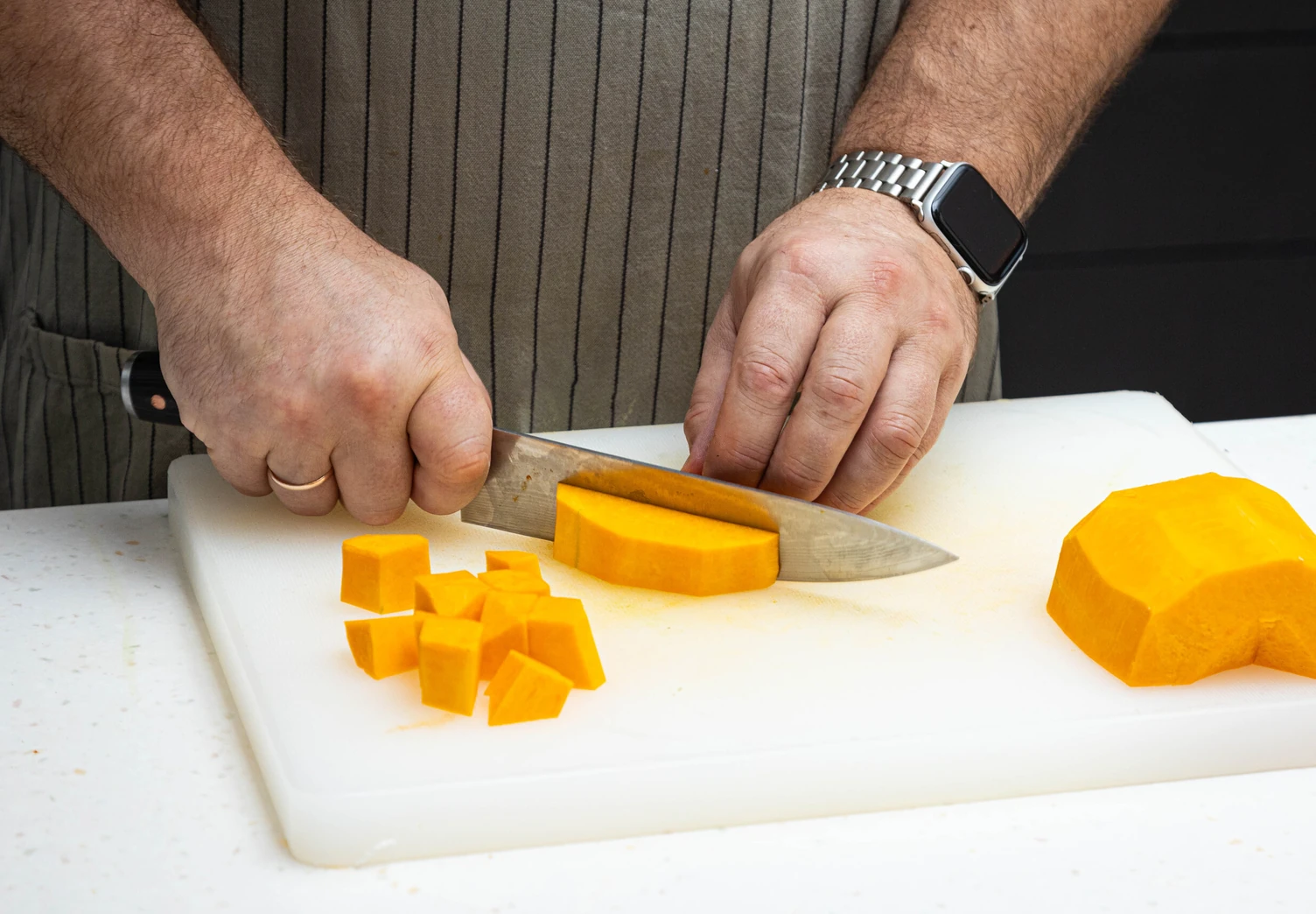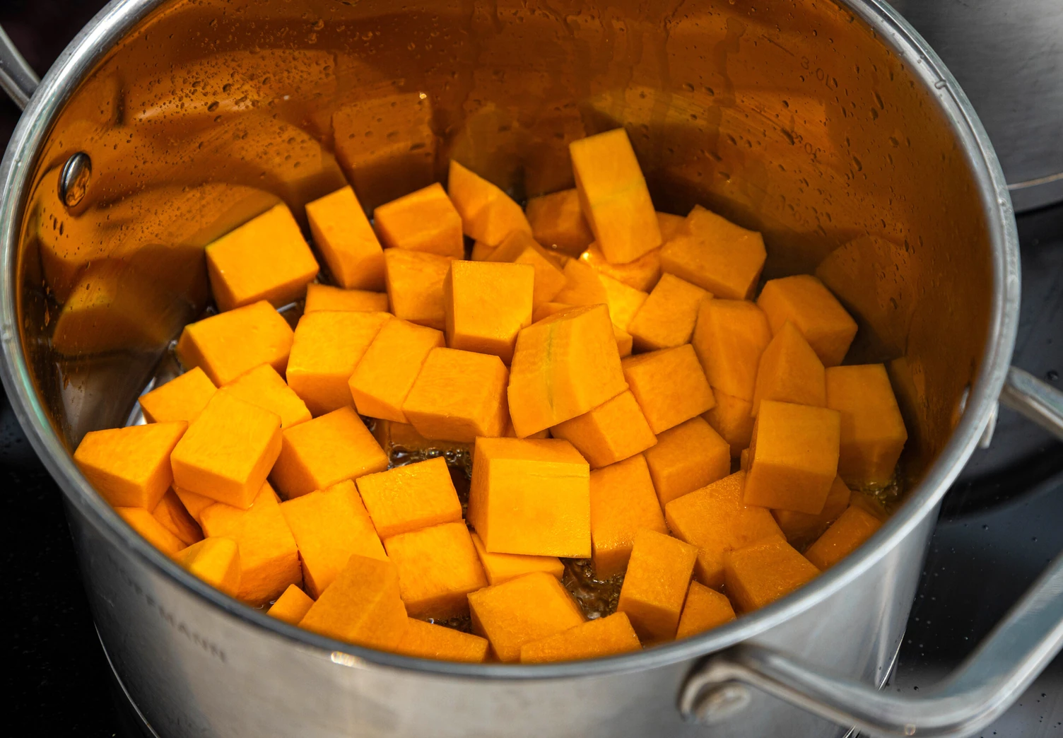 Разогрейте в кастрюле растительное масло и обжарьте кусочки тыквы до мягкости.