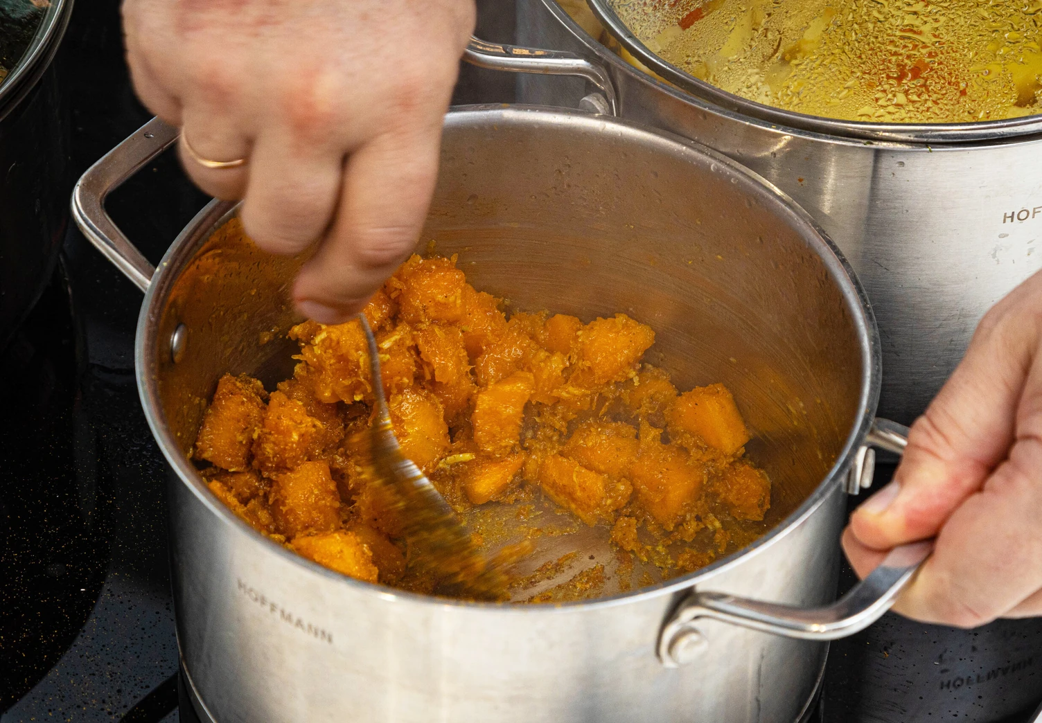 Добавьте тёртый имбирь и порошок карри в кастрюлю с тыквой. Жарьте, пока не проявится яркий запах карри.