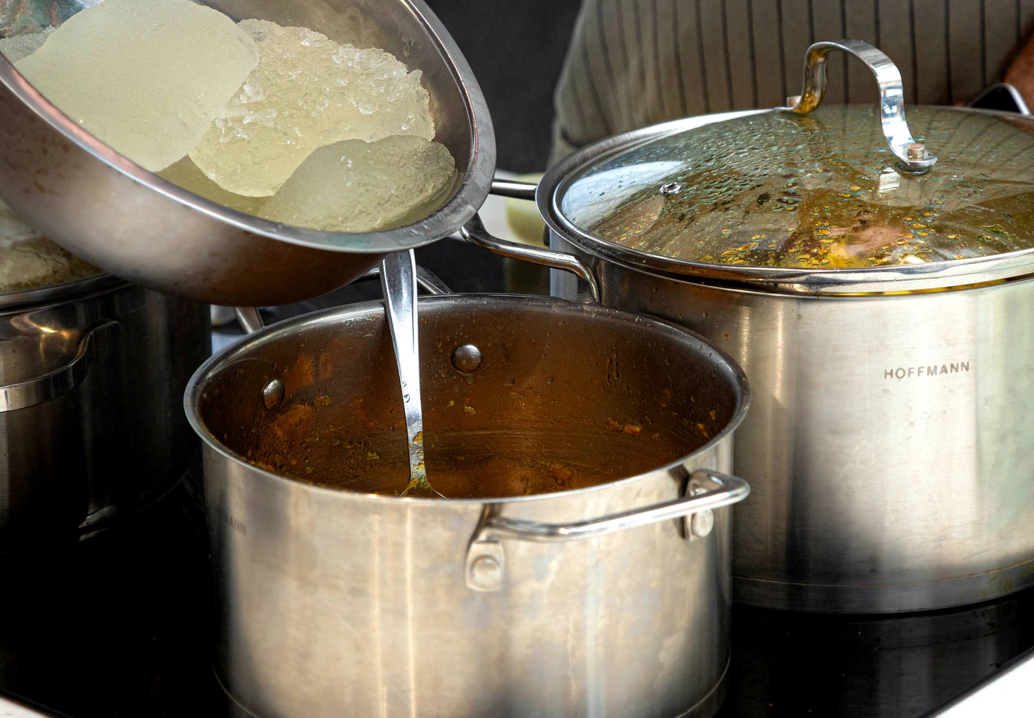 Залейте тыкву куриным бульоном и кокосовым молоком. Готовьте ещё 10 минут.