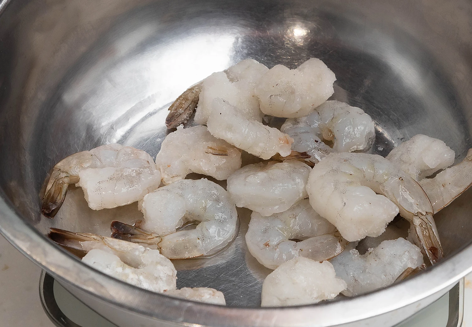 Предварительно размороженные креветки отварите в кипящей воде в течение 3–4 минут.
