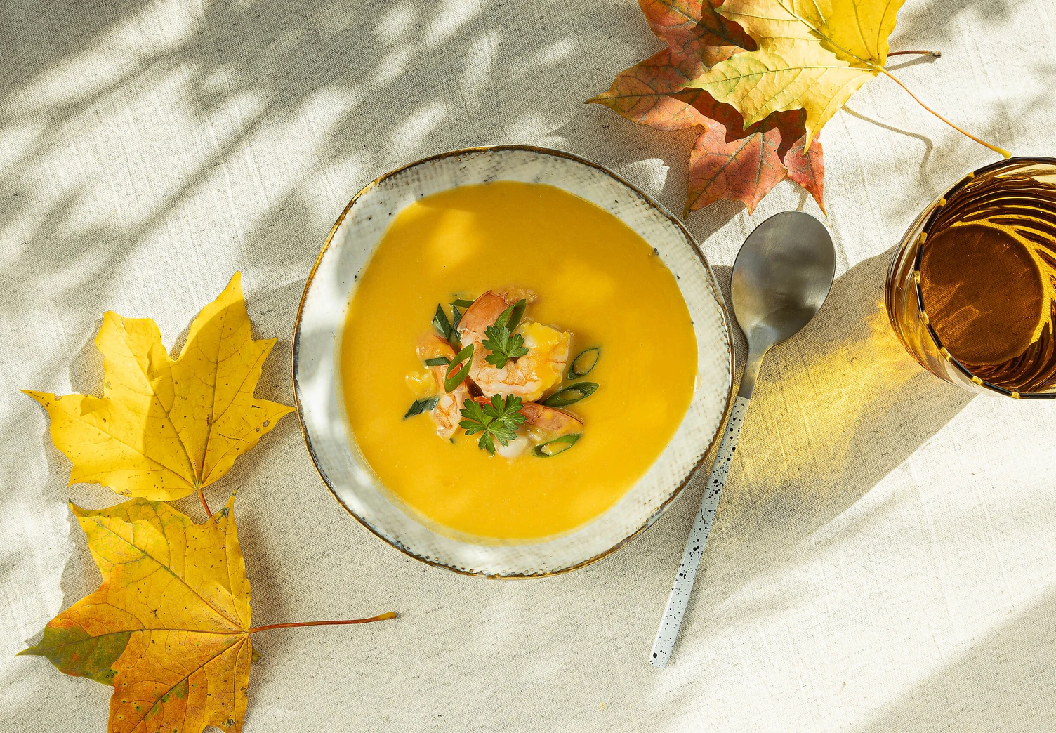 Тыквенных супов много не бывает! Приготовили ещё один на азиатский манер: на кокосовом молоке, с креветками и карри. Получился аппетитный крем-суп с экзотическими нотками — нежный, согревающий и по-настоящему осенний.