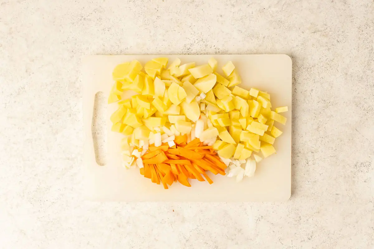 Овощи почистите, лук нарежьте мелкими кубиками, морковь — соломкой, картофель — средними по размеру кубиками.