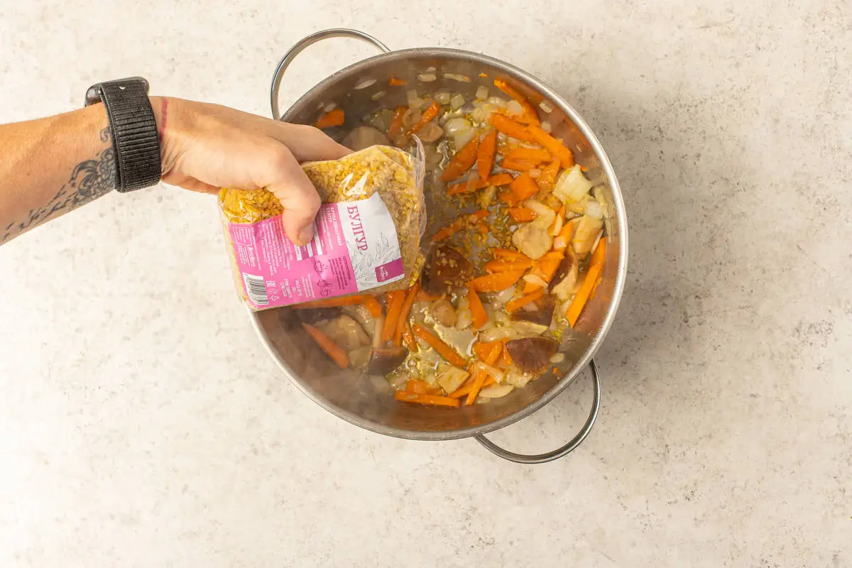 В кастрюле обжарьте лук и морковь на растительном масле. Добавьте грибы, булгур и картошку.