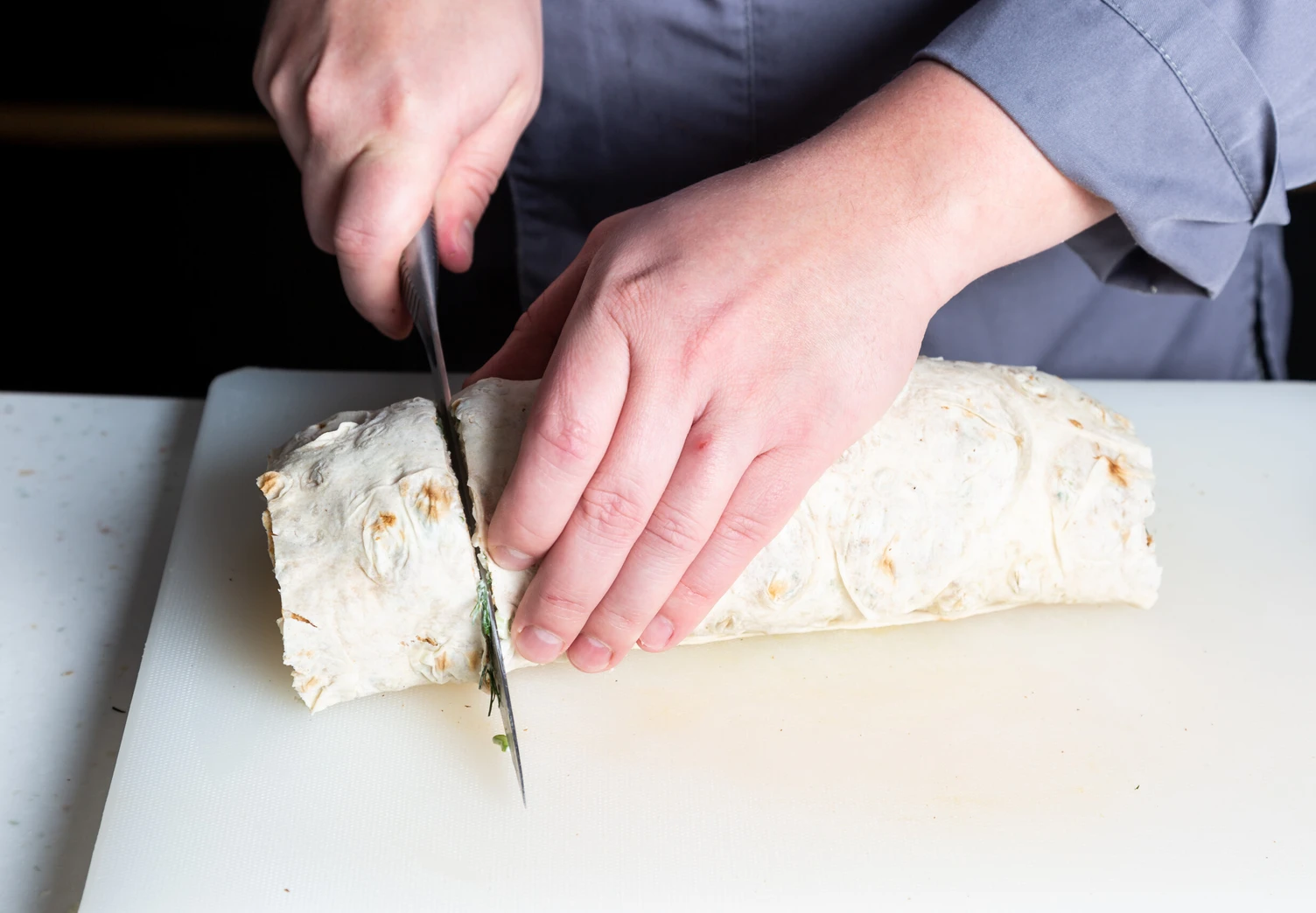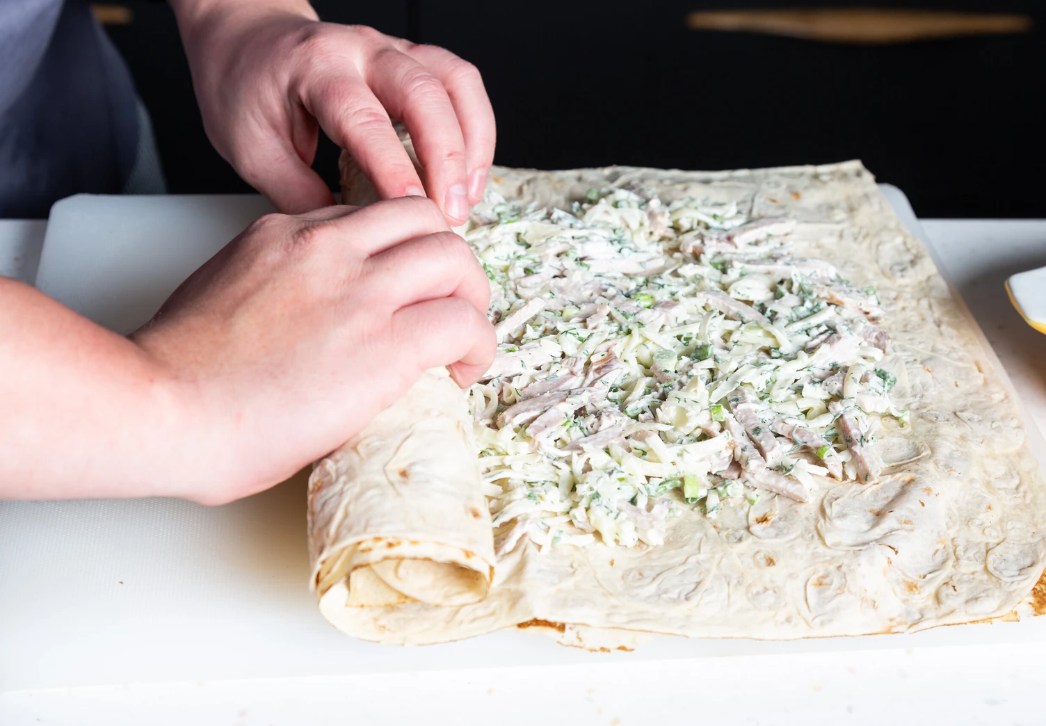 Плотно сверните лаваш в рулет и нарежьте на порционные «улитки».